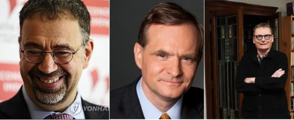 노벨경제학상 수상자인 MIT대의 대런 아세모글루 교수와 사이먼 존슨 교수,그리고 하버드대의 제임스 로빈슨 교수(왼쪽부터)@사진 연합뉴스