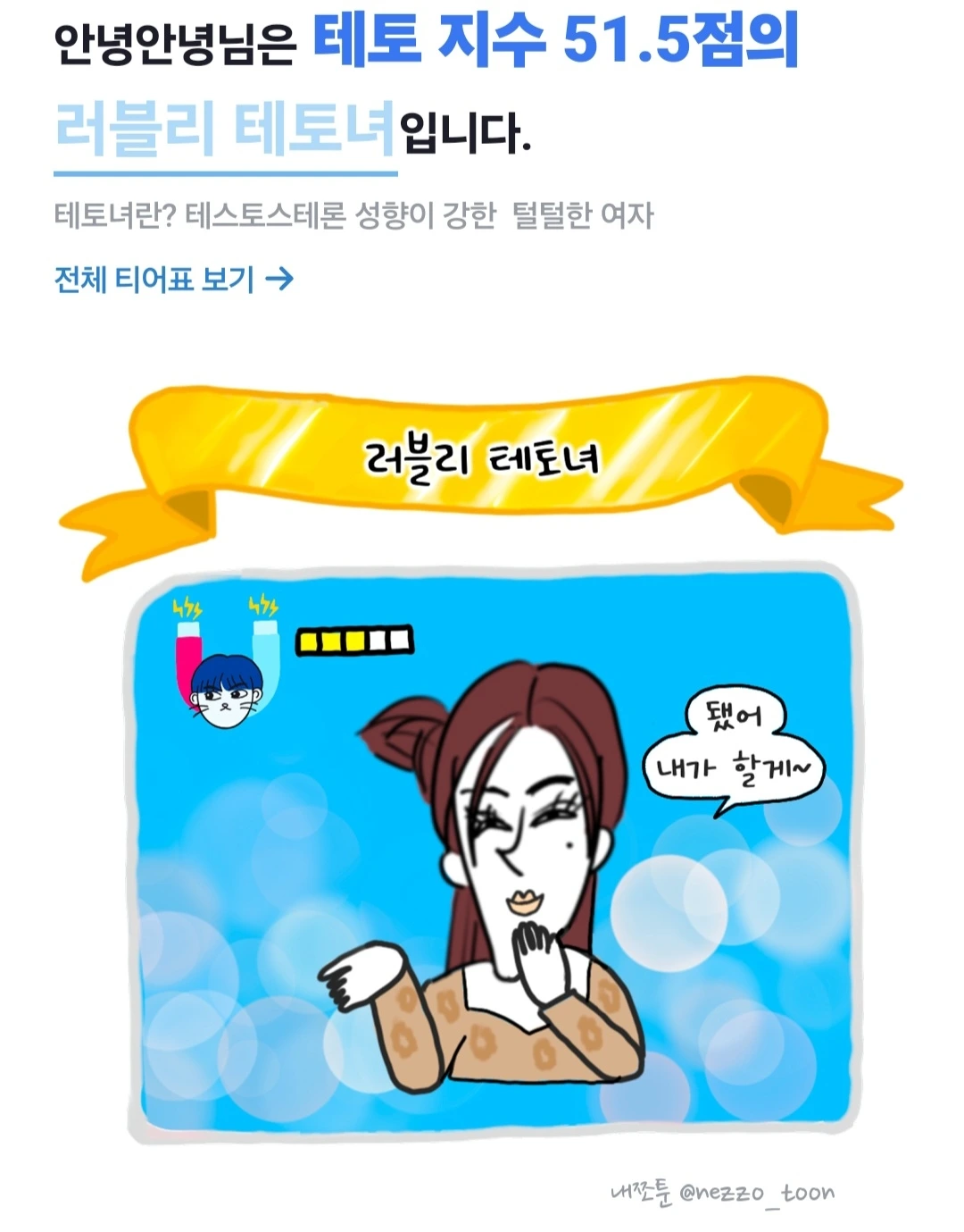 테스트하기 전에 난 어디에 속할까 고민하다 답을 내기가 어려웠다. 아무리 생각해도 두 성향이 다 있는 것 같았다. 평소 취향이나 남들에게 비치는 모습은 아마도 여성스러운 '에겐녀'에 가까운 듯한데, 내가 볼 때 나는 그렇게 여리여리한 성격은 아닌 것 같아서 또 '테토녀' 같기도 하고 그렇다.