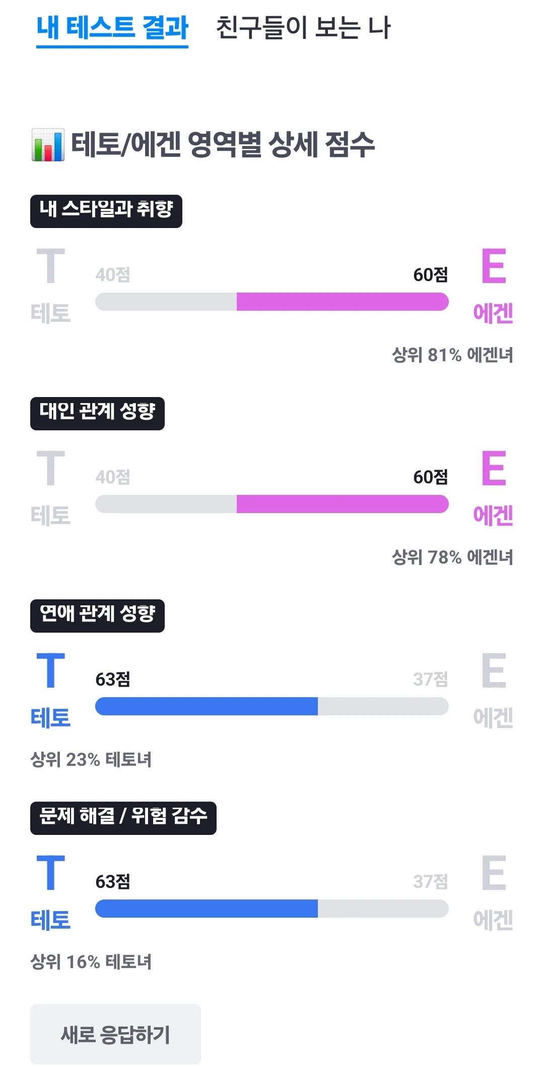 스타일과 대인관계에서는 에겐 성향이, 연애와 문제 해결에서는 테토 성향이 높게 나왔다.