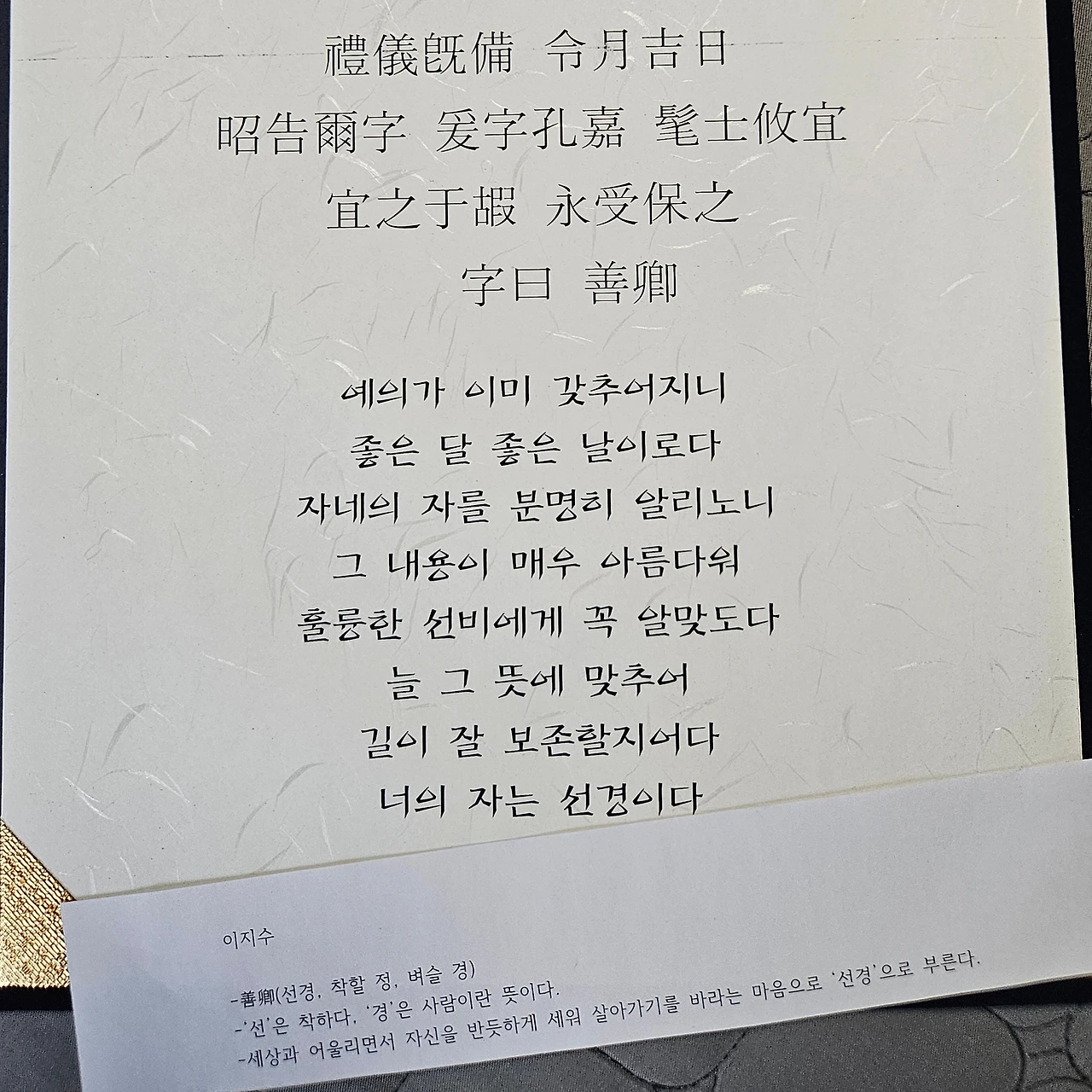 실은 나에게도 자(字)가 있다. 학부 때 한문학을 전공한 나는, 새내기 적에 학과 행사인 성년식에서 자를 받았다. 성년식은 전통적인 방식을 간소화한 절차로 치러졌다. 우리는 모두 한복을 입고 다도를 하며 경건한 마음으로 참여했다. 선배들께선 남자 학우들에게는 갓을 씌워주셨고 여자 학우들에게는 비녀를 꽂아주셨다. 행사의 끝자락에 우리는 모두 하나씩 자를 받았는데, 나의 자는 선경(善卿)이었다. 착할 선에 벼슬 경으로 '세상과 어울리면서 반듯하게 살아가라는 마음'을 담았다고 하셨다.