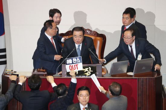 친일 언론에서는 문 의장이 선거법을 표결에 부치자 자유한국당 의원들이 의장석 앞에 가서 항의했다고 설명하고 있는데, 사실 친일 야당 의원들은 그보다 한참 전에 본회의 시작할 때부터 계속 항의 중이었다.