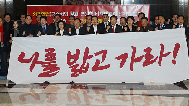 자유한국당은 꾸준히 선거법 개정이 좌파독재를 완성시키는 음모라고 주장해왔는데, 현재 안건으로 올라온 선거법 개정안은 다수당의 비례를 줄여서 국민의 지지율을 확보하고 있는 소수정당에게 돌려주자는 것이다.