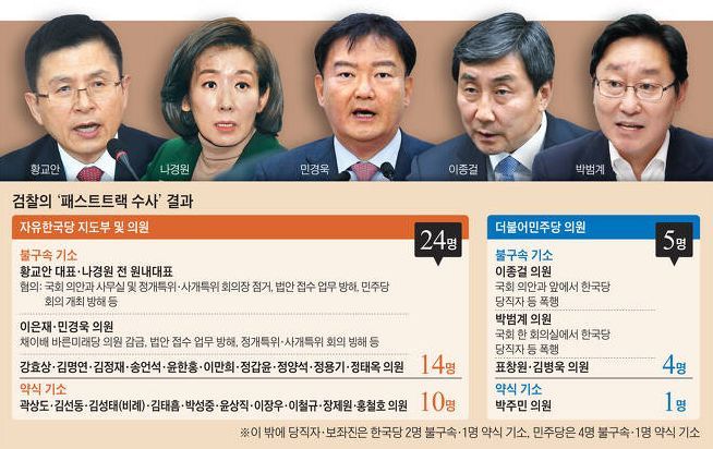 검찰은 패스트트랙 사건 수사를 전혀 하지 않고 버티기에 들어간 상황이었는데, 결국 대부분의 의원에 대한 소환 조사를 전혀 하지 않은 상태에서 경찰 수사를 근거로 기소를 처리했다. 사전에 경찰이 발표한 바에 따르면 100명 가까운 숫자의 의원들에게 혐의가 있었다는 것인데, 검찰이 최종적으로 불구속 기소 또는 약식 기소 처리한 의원은 겨우 28명에 불과했다.
