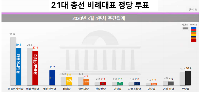 이번 총선에서 지역구는 대구 경북을 제외하고는 전국적으로 민주당이 압도적인 다수를 차지하겠지만 여전히 대구 경북은 친일 야당이 크게 승리할 가능성이 높으며, 비례 후보가 어떻게 분배될 것인지가 가장 이슈였는데 결과적으로 각 정당은 대부분 큰 변화 없이 대충 원래 지지율대로 비례대표를 차지할 것으로 보인다.
