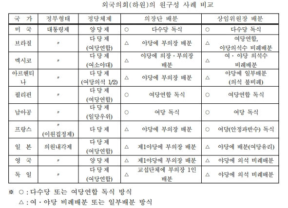 외국의 경우를 보면 대체로 영국, 독일, 일본 등 내각제 국가에서는 의석수를 기준으로 야당에게도 상임위원장을 배분하지만 미국, 프랑스, 필리핀 등 대통령제 국가에서는 제1당에게만 상임위원장을 배분하는 경우도 많다.