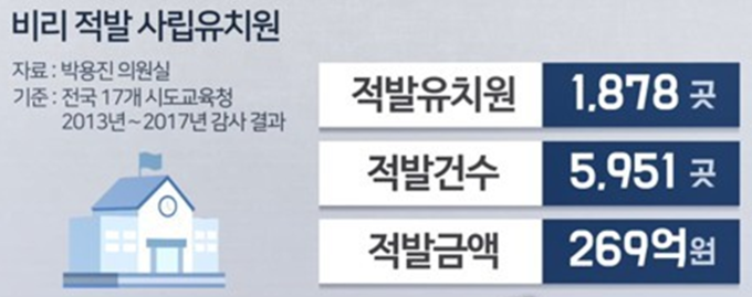 해당 유치원은 2017년 사립유치원 종합감사에서 교비 8400만 원 및 수익자 부담금 2억 900만 원을 교육 목적 외에 사용했으며 수익자 부담금을 교비계좌가 아닌 원장과 교사 개인명의 계좌로 수납한 사실이 적발됐다.