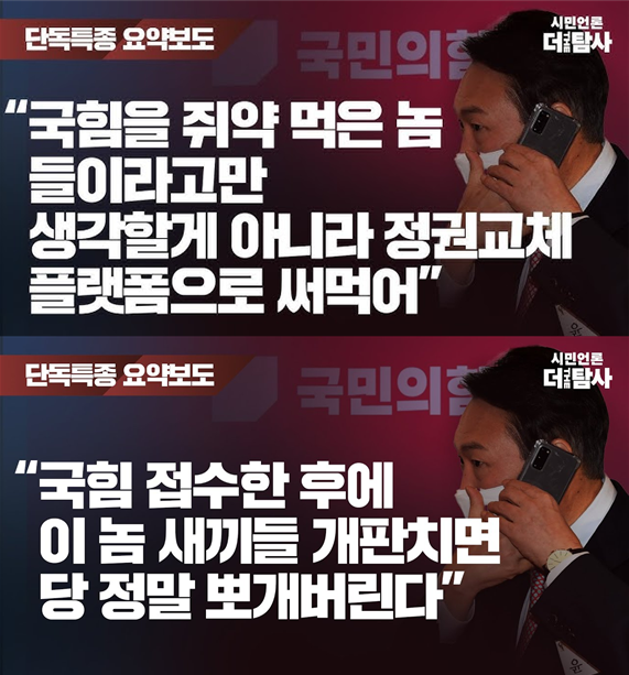 최근 친일 여당과 검찰이 굳이 다시 꺼내서 논란이 된 기사에서 남욱 변호사의 대검 중수과장이 조우형에게 커피를 타줬다 라는 진술을 인용한 후 당시 중수과장은 윤석열이었다 라고 언급한 게 가짜뉴스라는 건데, 실제로 커피는 담당한 검사도 아닌 직원이 타줬을 수도 있고 누가 커피를 타줬느냐가 문제가 아니지만 당장 기사에서 윤석열이 커피를 타줬다고 명시한 것도 아니다. 이 기사를 가짜뉴스로 규정하며 기사에 조우형과 김만배의 대화가 인용되는데 알고 보니 김만배가 윤석열을 떨어뜨릴 목적으로 허위 인터뷰한 기사이니 이런 기사를 낸 것은 쿠데타에 준하며 사형에 처해야 할 범죄라고 하고 있는데, 막상 조우형과 김만배의 녹취에서 윤석열의 이름은 전혀 언급도 안 되며 단지 수사가 부실이었다는 이야기를 한 것이고 기자가 그 수사의 책임자가 윤석열이었다는 사실을 언급한 것이다.