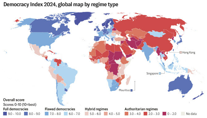 영국의 이코노미스트 산하 리서치 회사인 EIU(Economist Intelligence Unit)가 지난 2월 발표한 민주주의 지수 보고서에서 대한민국의 민주주의 점수는 전년 대비 0.34점이 감소한 7.75점을 기록하여 민주주의 순위가 전년 대비 10계단 하락한 32위를 기록했다. EIU도 V-dem과 마찬가지로 각 국가의 민주주의 수준을 네 등급으로 나누어 평가하는데, 올해 한국은 완전한 민주주의(Full democacy)에서 결함 있는 민주주의(Flawed democracy)로 등급 하락했다. EIU는 이번 보고서에서 올해 요주의 국가로 한국을 꼽으며 2024년 윤석열의 계엄 선포 시도로 인한 악영향은 2025년에도 국회와 국민들 사이에서 양극화와 긴장 심화라는 형태로 지속될 가능성이 크다고 했다.