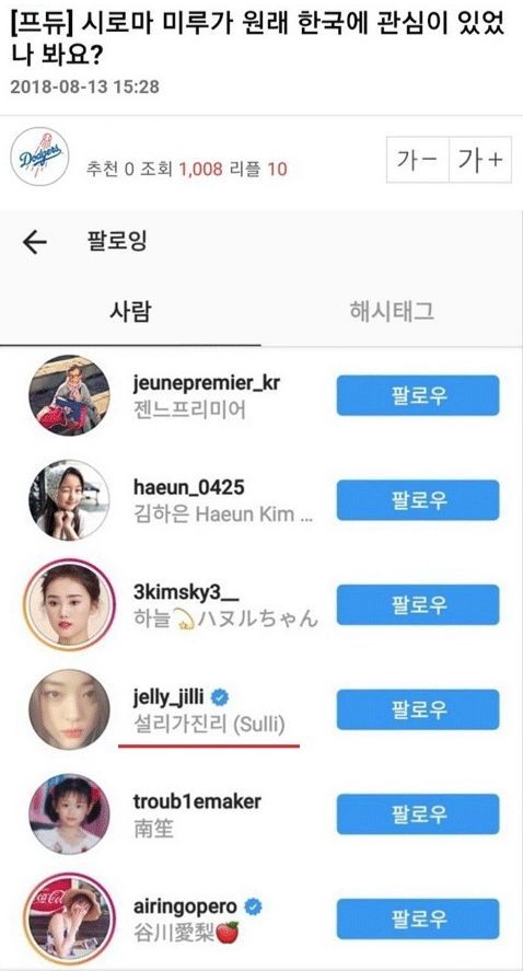 이후 엠넷 마이너 갤러리에서 2018년 8월 7일에 미루가 팔로우하고 있는 한국 연예인 명단을 다 표시한 게시글이 발견되었는데 여기에 설리가 없어서, 사실은 설리가 소녀상 게시물을 올리기 훨씬 전부터 언팔되어 있었을 가능성이 높아 보이는 상황이다.