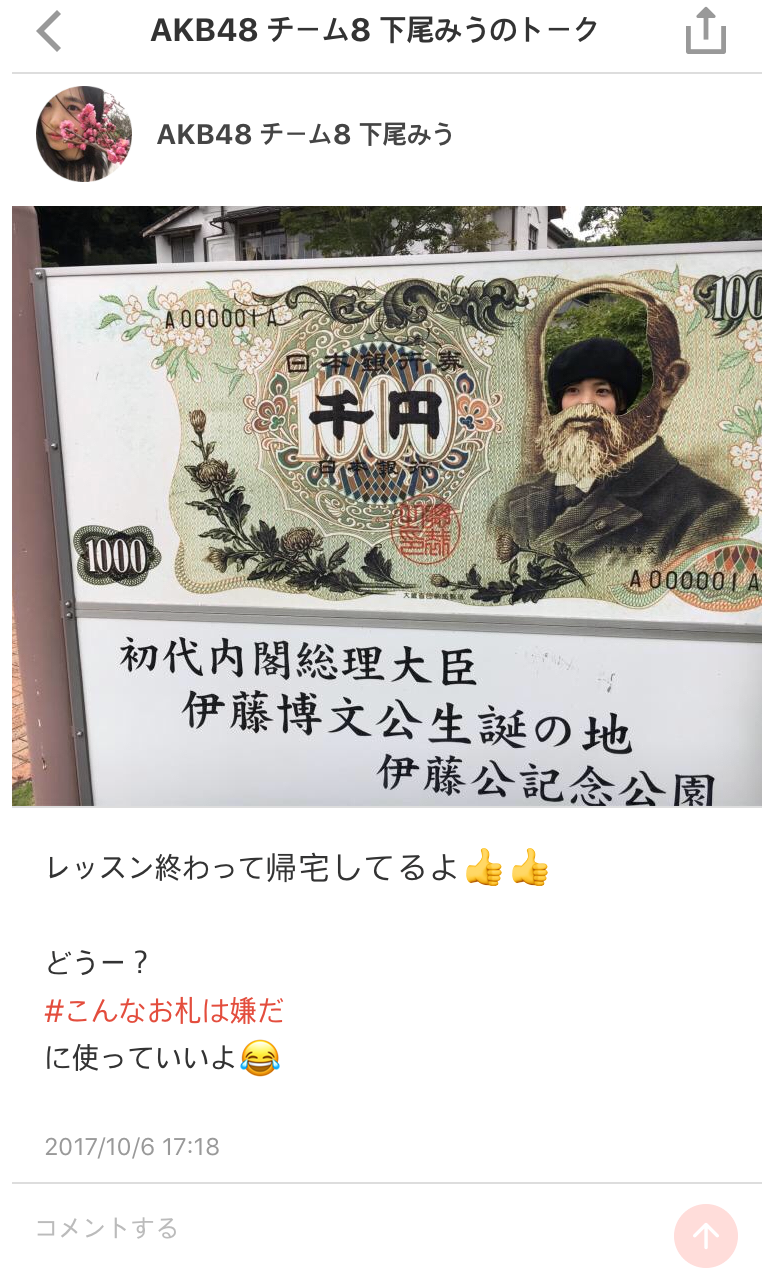 이토 히로부미 박물관 앞에 있는 포토존으로 보이는데, "레슨이 끝나고 집에 가는 길이야. 어때? '#이런 지폐는 싫어.' 라는 태그를 써도 좋아." 라는 멘트를 달아놓았다.