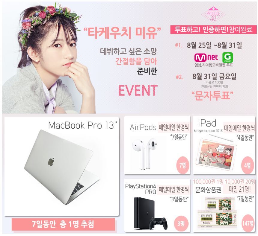 기존 많은 오디션 프로그램에서 투표 인증을 하면 추첨을 통해 치킨 기프티콘을 준다는 등의 영업은 항상 있었다. 이런 영업도 따지고 보면 부정행위라고 할 만하지만 시각에 따라서는 팬들이 어차피 투표할 멤버에게 투표를 하고 행운권 추첨처럼 하나의 이벤트로 생각할 여지도 있어서 애교로 봐주는 경향이 있었으나, 이번에 타케우치 미유의 팬덤은 투표 인증 이벤트에 아이패드, 플레이스테이션과 맥북, 문화상품권을 상품으로 거는 등 정도가 지나친 부분이 있었다.