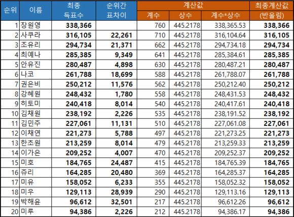 아무래도 총 투표수 자체가 많이 줄어들었다는 사실을 감추겠답시고, 연습생들의 전체적인 득표수의 크기 자체를 늘려서 발표했을 가능성이 매우 커 보인다.