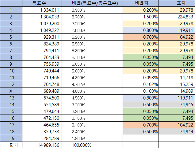 어쩌면 원래 실제 1위 득표는 749,444표였는데 20인 각자의 득표수에 일정 배수를 곱해서 최종 득표수로 표시했을 가능성도 있다.