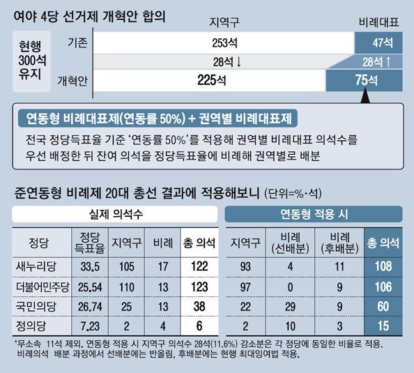 연동형 비례대표제는 간단히 설명하면 사표 방지와 민의의 비례적 반영을 위해, 지역구 선거로 확보한 의석수보다 높은 지지율을 보유한 정당은 그만큼 비례대표를 많이 뽑아줘서 국민의 지지도 비율과 국회의 의석수 비율이 비슷하도록 만들어주자는 제도이다.