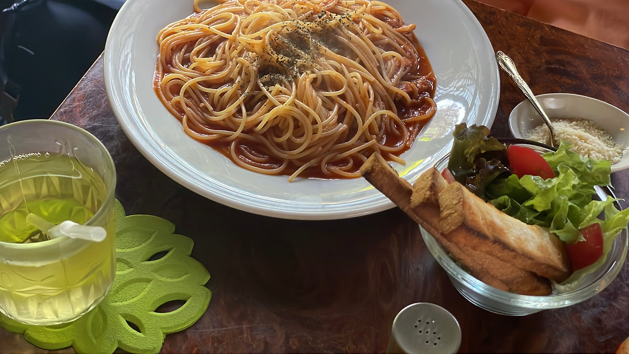 파스타와 빵과 샐러드, 자연광을 받아 더욱 먹음직스러워 보인다.