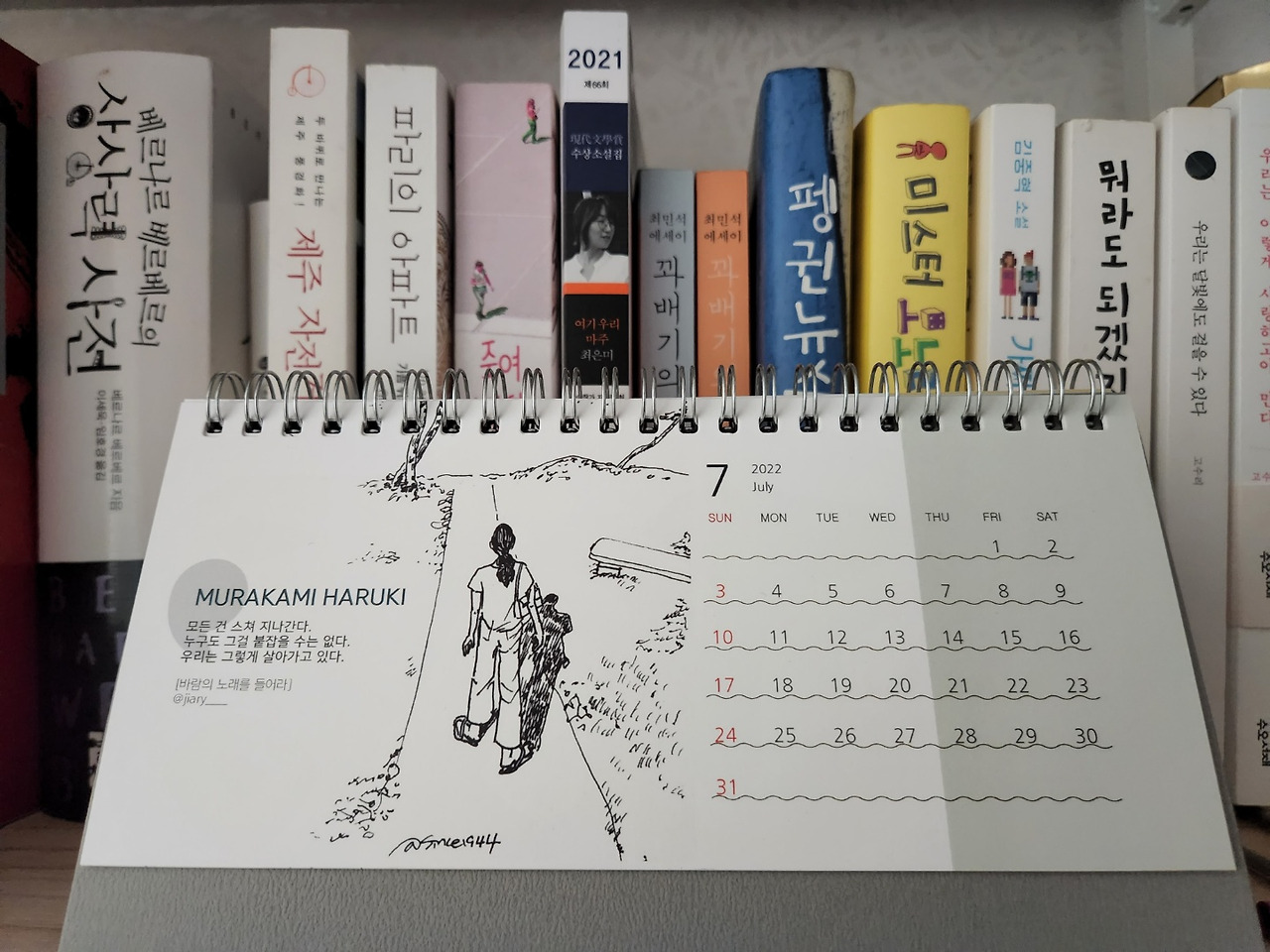 간헐적 글쓰기를 하는 동안 제 글을 좋아해 주시던 분이 있었습니다. 그분이 올해 초 직접 그린 그림을 넣어 제작하고, 선물로 주셨던 귀한 캘린더를 보며- 7월 말 방구석에서 SNS에 끄적였던 글입니다. 재밌다며 메시지도 주시고, 댓글도 달아주신 덕분에 간헐적으로나마 글쓰기를 이어왔습니다. 이 글을 빌려 감사드린다는 말을 슬쩍 쿵 가을바람에 태워 날려 보내니 약소하지만 따스하게 닿기를 바라봅니다.
