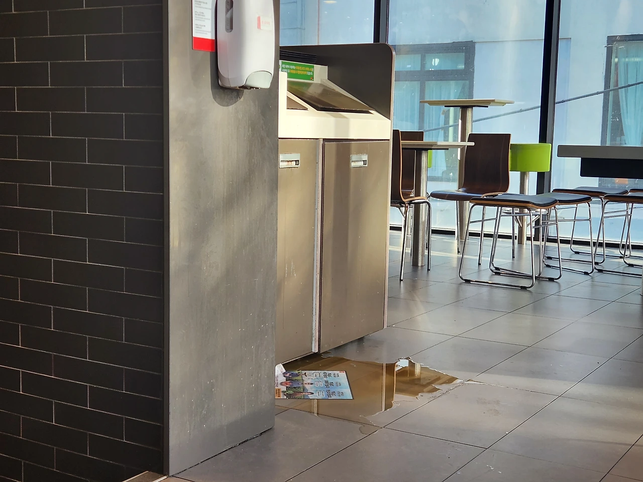 흥건하게도 음료가 쏟아진 쓰레기통 앞을