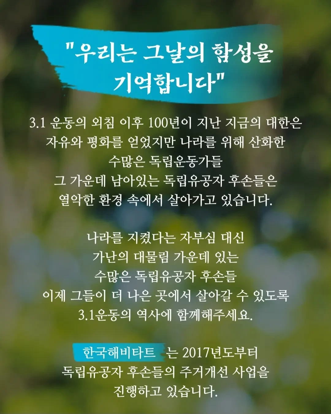 시답지 않은 대답이 시답지 않게 함께하면 괜찮겠다 싶은 일을 슬쩍 소개를 드리려고 합니다. 작고 소중한 제 월급도 몇 년 째 쉐어되고 있는 후원인데요. 한국해비타트가 진행하는 독립유공자 후손 주거개선 캠페인입니다.