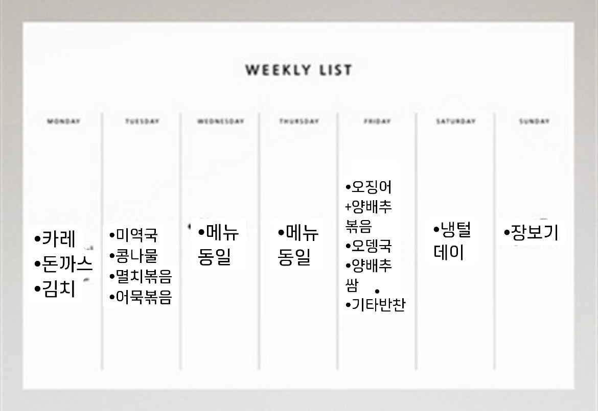 장보기 전, 아이 어린이집 식단표를 참고하거나 혹은 생생정보통이나 한국인의 밥상과 같은 제철식재료 프로그램을 보며, 먹고 싶었던 메뉴들을 넣어 식단표를 작성한다. 너무 디테일하게 할 필요는 없고, 메인요리 1개와 반찬 1-2개 정도 적어놓으면 하나의 식재료를 여러 군데 활용할 수 있다.