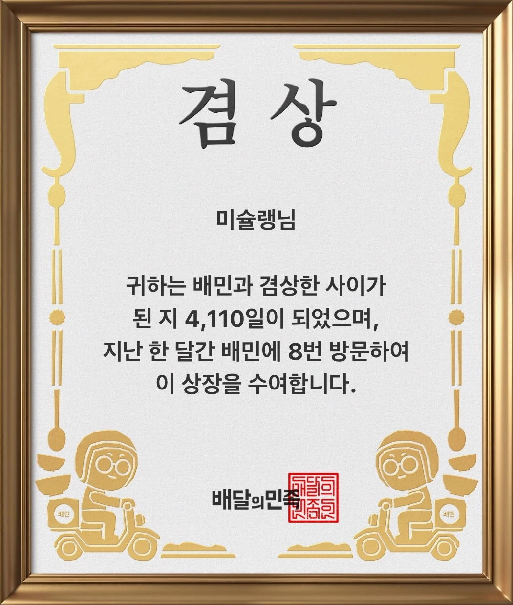 자주 이용하는 배달앱에 들어가니, 지난달에는 무려 8번이나 시켜 먹었다며 상장까지 주더라. 신랑 핸드폰으로도 시켜 먹고 다른 배달어플로도 이용한 내역들이 있으니 어마무시한 식비가 지출된 셈이다. 저절로 ‘뜨헉!’ 소리가 나온다.