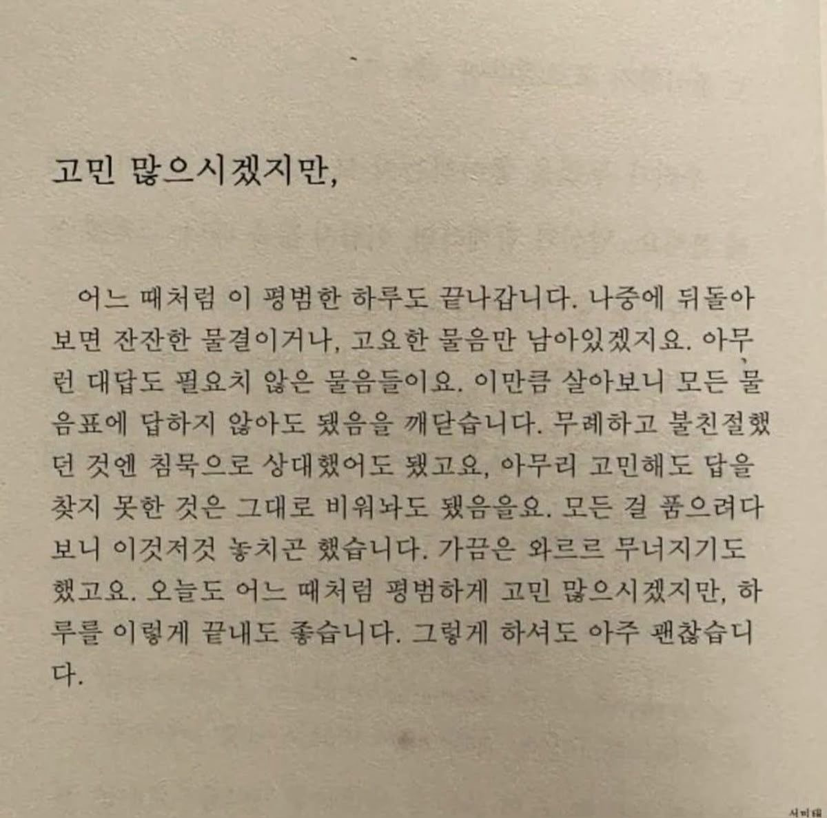 열 여덟살의 나에게도 말했다. "괜찮아 눈물을 참지 않아도 돼. 넌 아직 어려. 곧 스무살이 된다면 엄마의 슬하에서 벗어난 어른이 되고 싶어하고 있겠지만, 굳이 그러지 않아도 돼. 너무 힘들면 울어. 참지마 네가 할 수 있는게 눈물밖에 없다고 해도 괜찮아."