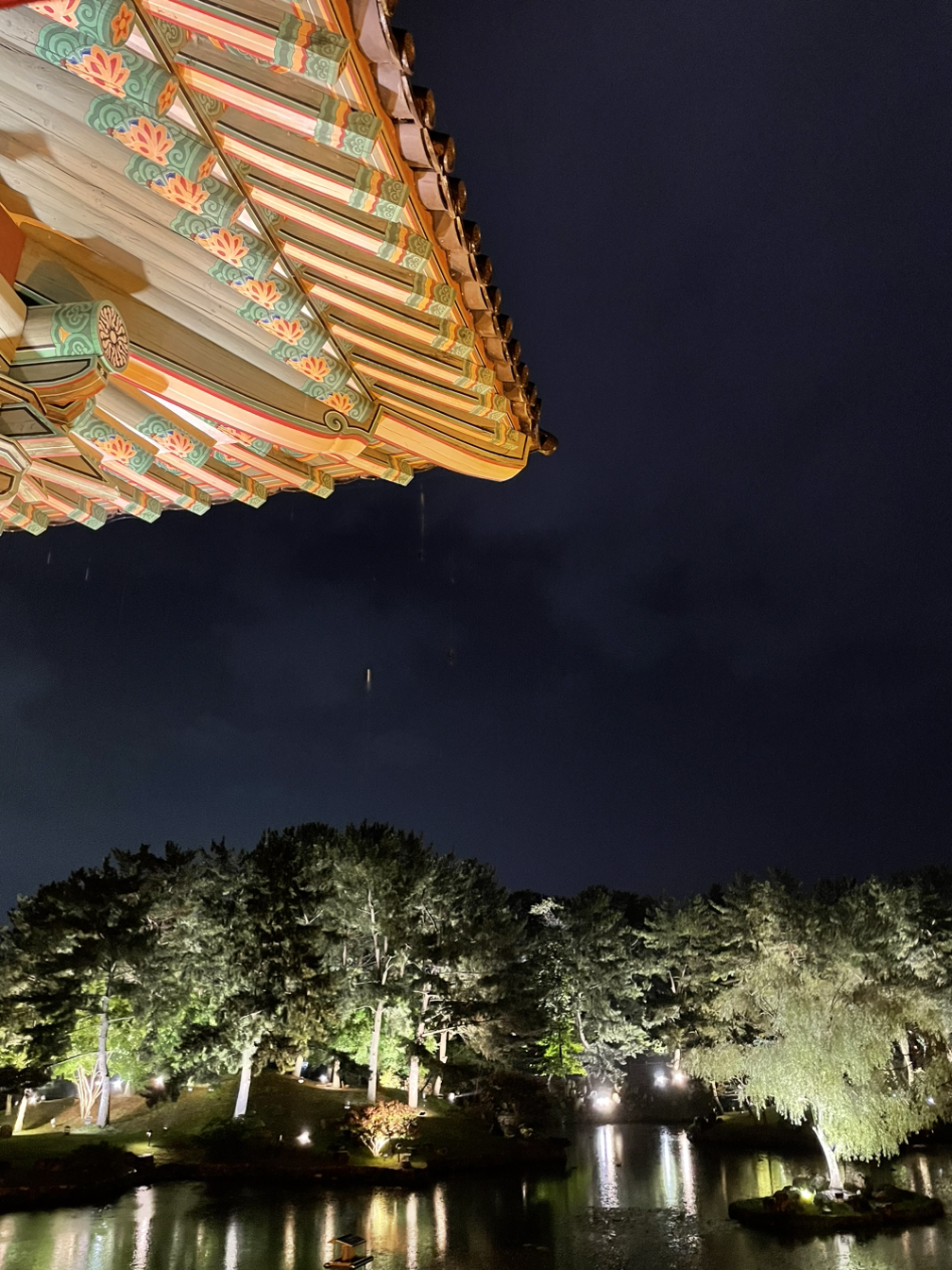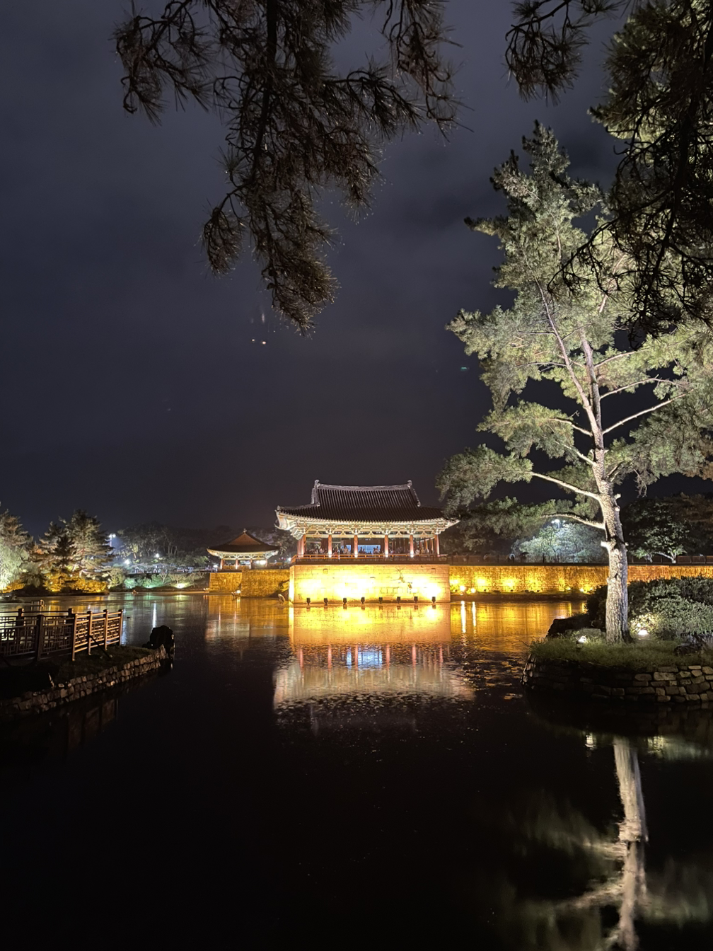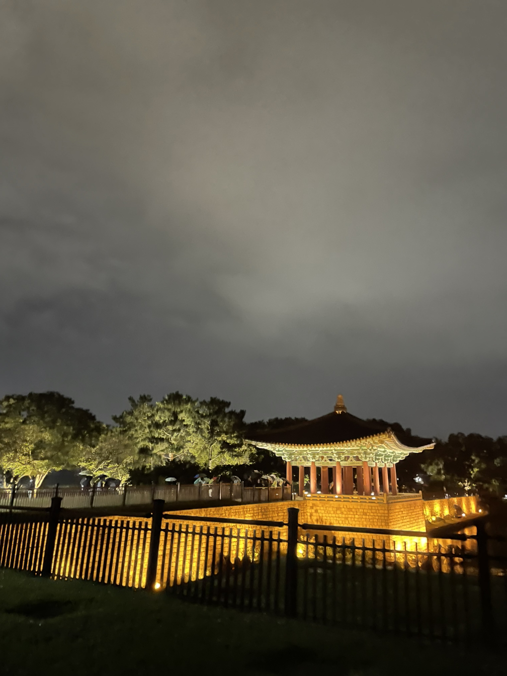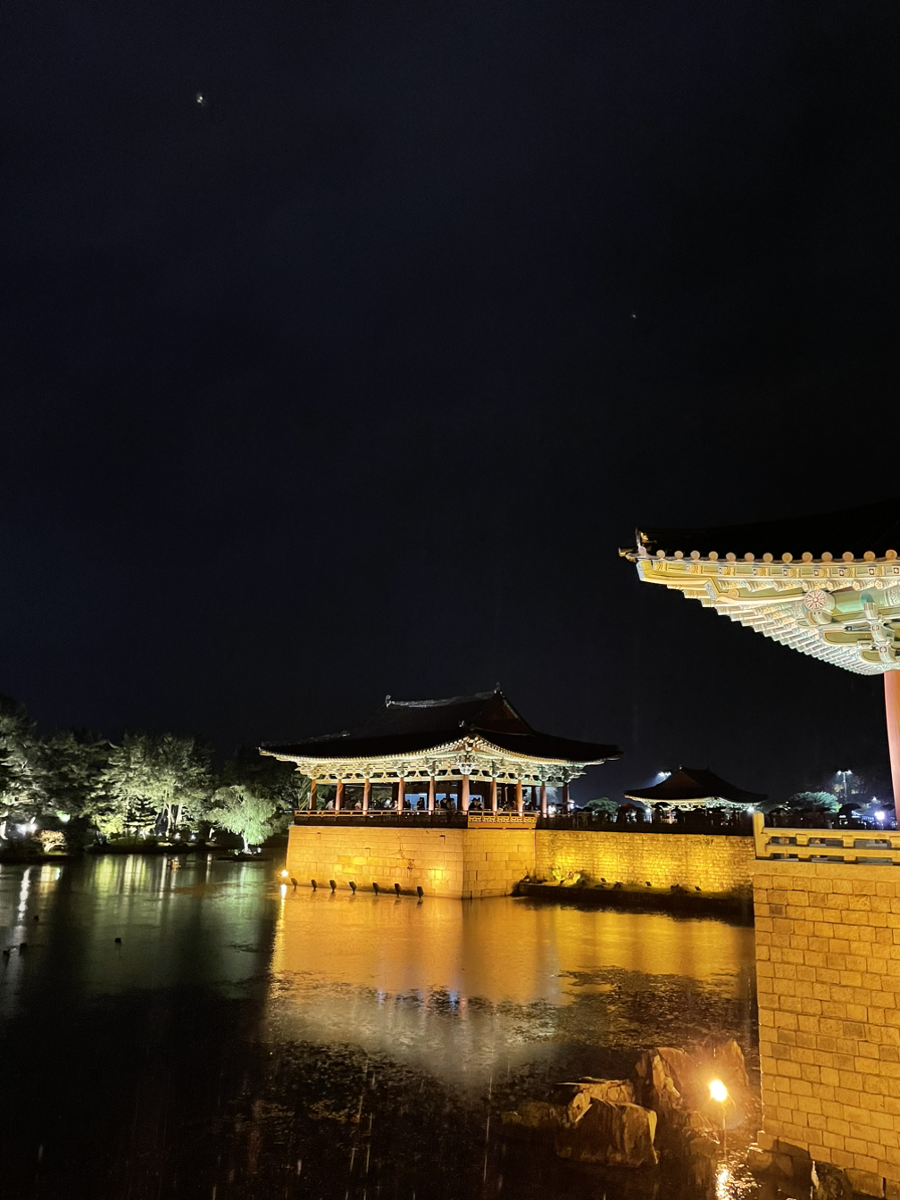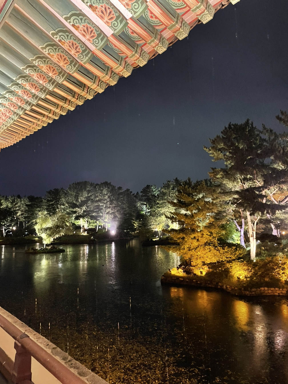 조금 쉬고 나니 7:30분쯤 되었는데, 비가 오기 시작했다. 무계획 여행에 날씨도 보고 오지 않았던 터라 비 예보도 몰랐지만 우리는 가져온 옷을 모두 껴입고 동궁과 월지 야경을 보러 나갔다. 비가 오면 더욱 운치 있을 거라며 나섰다.