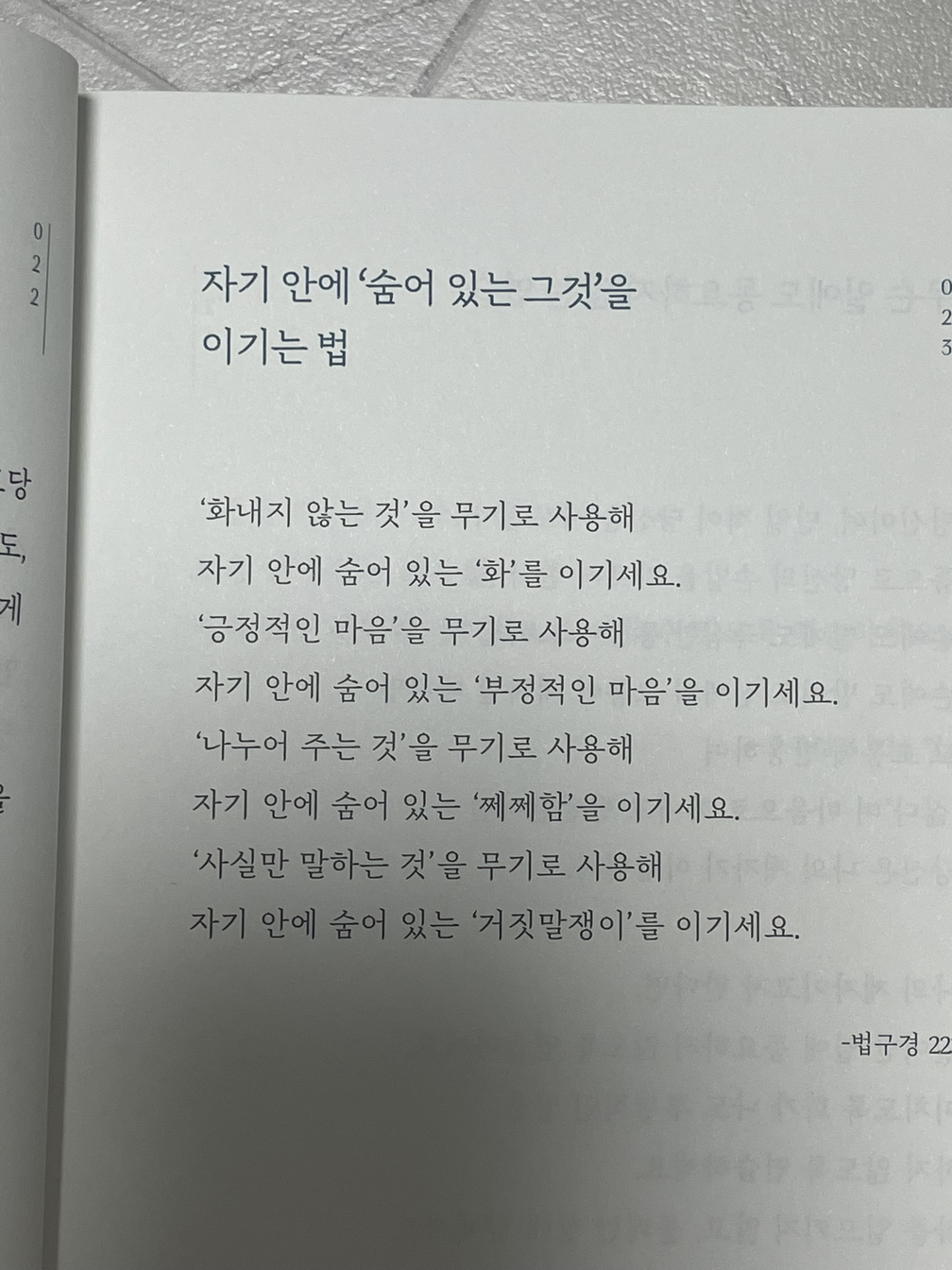 부처의 가르침에선 화가 나면 화를 참는 무기로 화를 이겨내고, 감정 쓰레기통이 필요하면 내 안에 쓰레기통을 만들어 그 안에 버리는 무기를 사용해 떨쳐내면 되며, 부정적인 마음이 들면 긍정적인 마음의 무기로 이겨내라지만 아직 거기까진 못 간 듯하다. 26년의 트라우마를 5년의 시간으로 덮기엔 터무니없이 짧고 얕지만, 그래도 5년의 시간은 적지만 강했다.