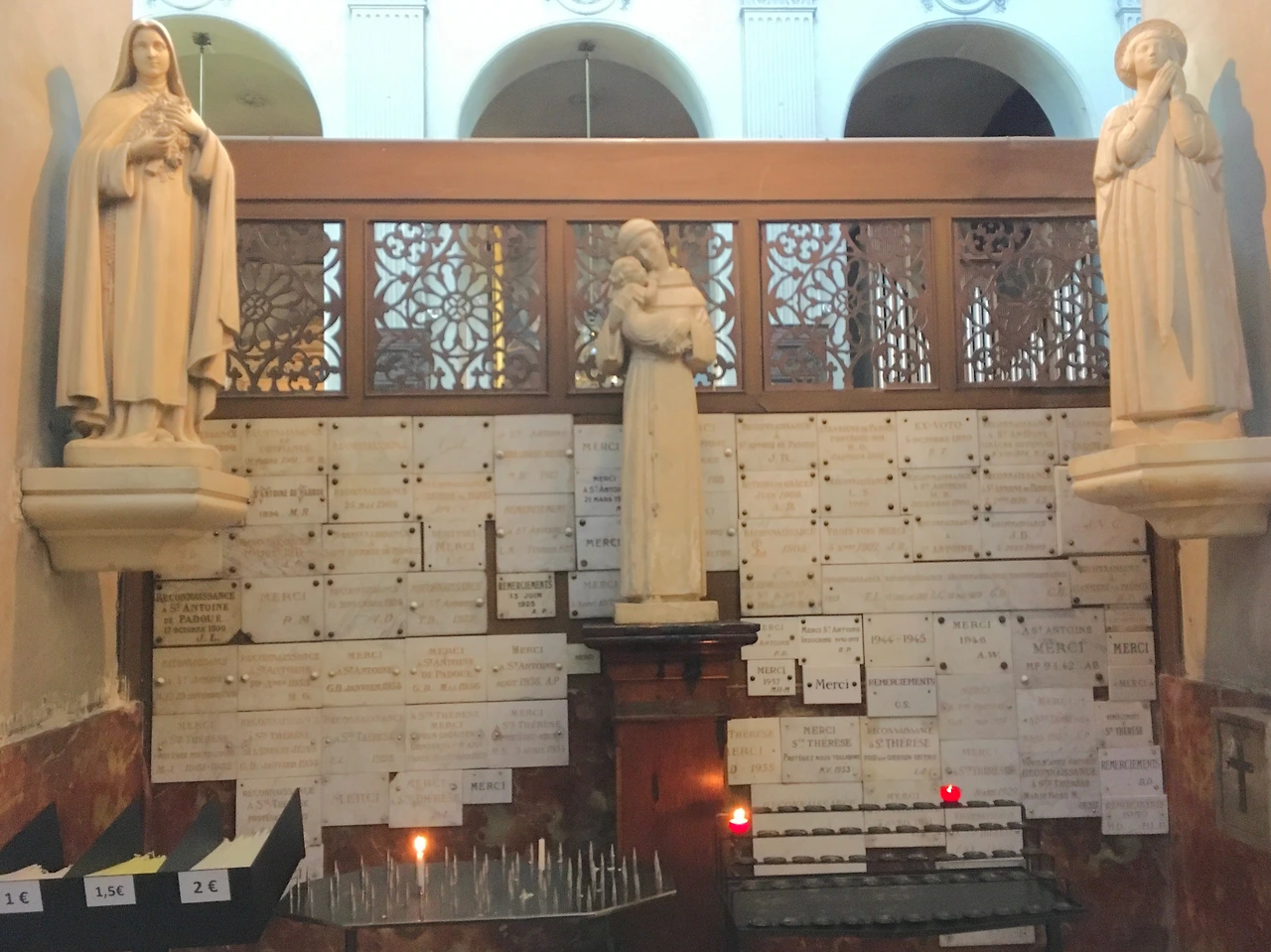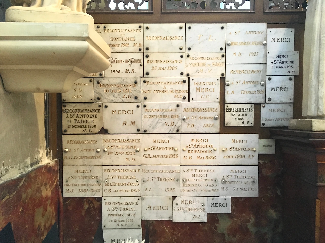 각 종교의 특색에 따라 봉헌물에는 다양한 오브제들이 쓰인다. 가령 고대 그리스 문명에서는 올림푸스 신들의 모습과 유사한 작은 석고상을 바치곤 했다. 천주교에서는 이렇게 대리석 판에 성 앙투완에게 축복, 안녕을 기원하는 경구와 함께 날짜가 함께 쓰인다. 살펴보니 제일 오래된 것은 1905년에 만들어진 것으로 왼쪽 제일 상단에 자리하고 있었다.