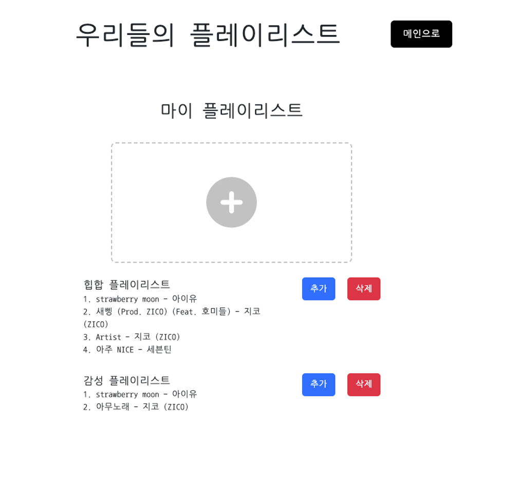 첫번째 프로젝트는 <웹서비스 만들어서 배포하기> 였다. 우리팀이 만들고 싶었던 것은 나만의 플레이리스트를 만들어서 노래를 검색해 추가하는 서비스였다. 나를 포함한 우리 팀원들에게는 쉽지 않은 과제였다. 우리는 각자 필요한 기술 스택 - Git, 자바스크립트, 파이썬, 몽고디비, aws 클라우드 컴퓨터, 시큐어 셸 - 을 전부 다 알지는 못해도 한 두개씩은 잘 알았다. 부족한 걸 채워주면서 가끔은 답답할 때도 분명 있었겠지만, 돌이켜 생각하면 떠오르는 장면들은 온통 즐거웠던 시간들 뿐이다.