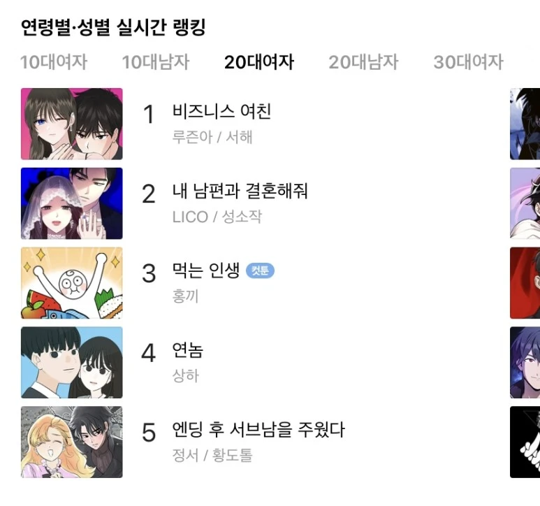 네이버웹툰은 복잡하고 다변화되는 개인화되는 고객의 니즈를 충족시키기 위해 웹툰 전체 실시간 랭킹과 연령 및 성별 실시간 랭킹을 각각 따로 제공한다. 이와 같은 맥락으로 베스트 도전 (일반인 웹툰 작가 도전 창구) 웹툰도 따로 실시간 랭킹을 제공한다.