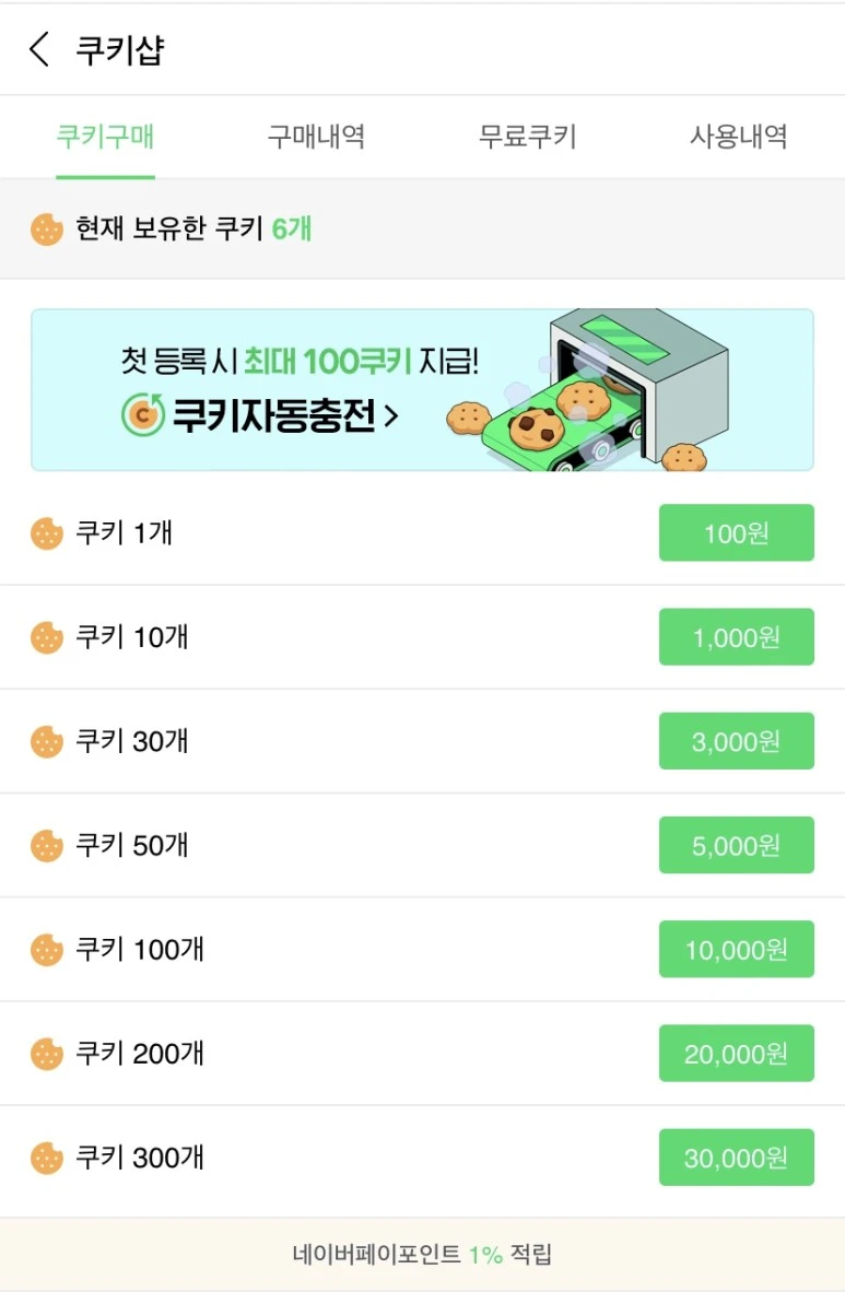 사용자가 별도 이용권을 구매하는 행위를 이른바 '쿠키 굽는다'고 하는데, 이 행위는 유료 웹툰을 읽기 위해서 이뤄진다. 유로 웹툰의 경우 보통은 완결 웹툰이거나, 드라마 동시 상영 중인 웹툰 등이 있다. 또는 연재 중인 웹툰의 유료 미리보기 서비스가 있다. 네이버 웹툰에 속한 작가는 연재 당시 네이버가 임의로 정해준 요일에 맞춰 매주 한 에피소드를 무료로 공개하는데, 다음 화가 궁금한 이용자들은 별도로 유로 미리보기 서비스를 통해 먼저 다음 에피소드를 만나볼 수 있다. 미리보기 결제 가격은 콘텐츠마다 가격이 다른데, 보통은 개당 쿠기 2개가 차감된다.