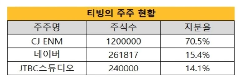 티빙의 주주 현황은 CJ E&M (1200000주, 70.5%), 네이버 (261817주, 15.4%), JTBC스튜디오 (240000주, 14.1%)의 지배구조로 되어있다.