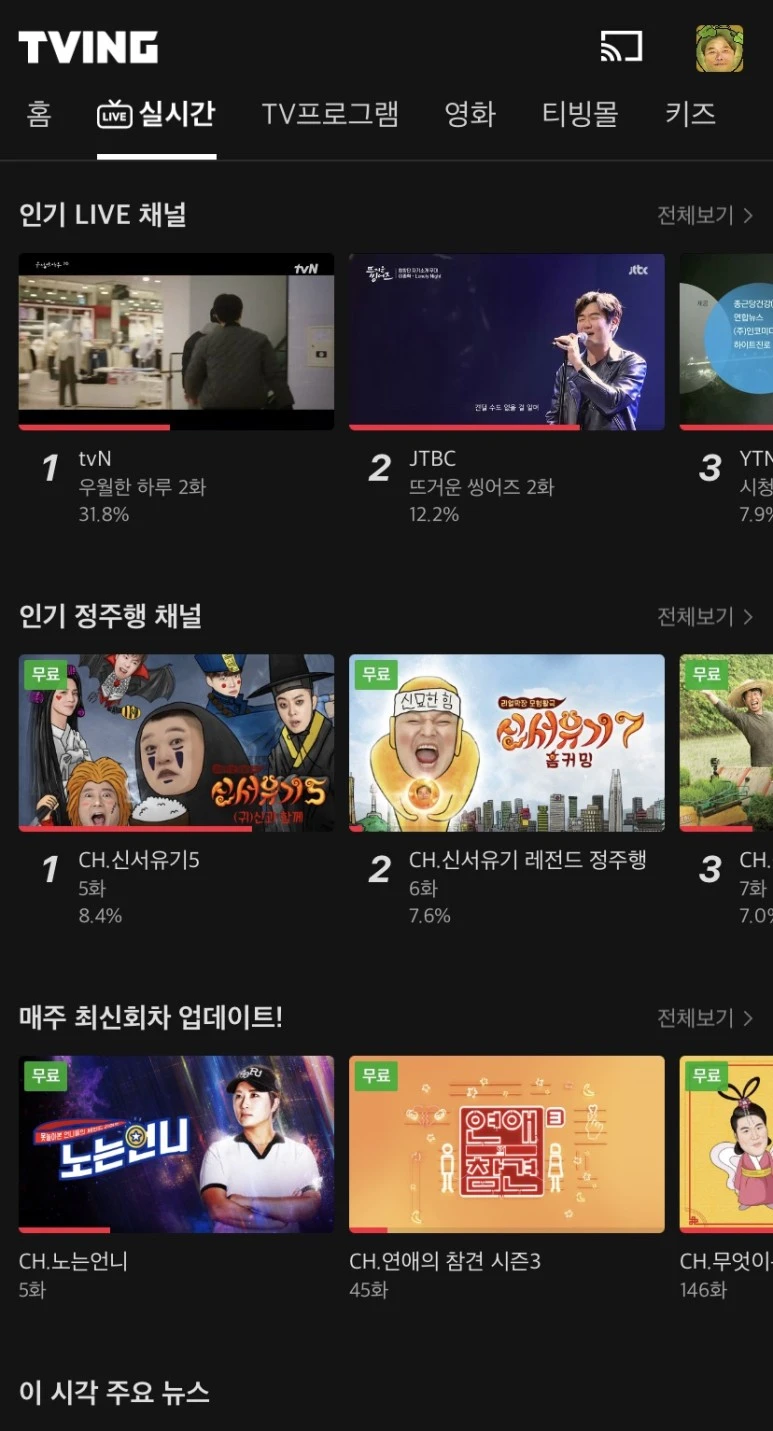 다양한 프로그램을 실시간으로 그것도 무료로 시청할 수 있게 됐다. 가장 좋았던 점은 뉴스 채널이 다양하다는 것인데, 그렇다보니 하루에 뉴스프로그램 하나는 보게 됐다. 집중해서 보지 않더라도 매일 어떤 사건이 일어났고 국회에서는 어떤 일이 발생했는지를 알고자 ‘이 시각 뉴스’를 틀어놓고 있다. 자주 쓰는 앱 티빙을 통해 뉴스 뿐만 아니라 실시간 콘텐츠에 대한 접근성이 좋아졌고 편리해졌다.