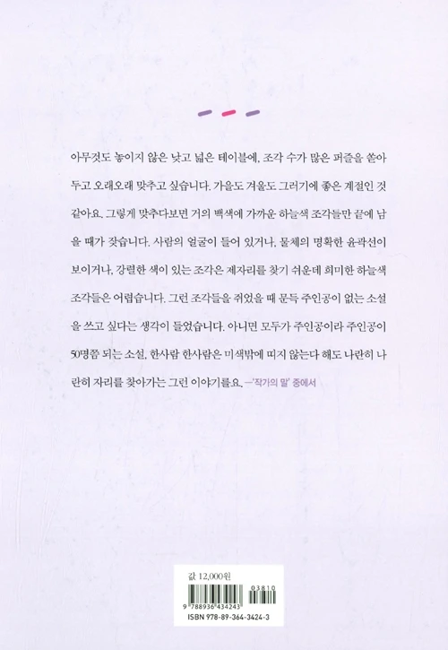 50명의 등장인물(실은 그보다 더되는)이 나오는 이 소설은 정말 게임같고 퍼즐같았다. 책장을 넘기면 넘길수록 나타나는 새로운 인물의 사연은 저마다 작은 세계관을 속속들이 담고 있었다. 새 페이지에서 스멀스멀 등장하는 익숙한 이름들을 토대로 이전 챕터를 다시 훑는 과정은 흩어진 퍼즐 조각을 살펴보는 듯 했다. 우리의 인생살이가 그렇듯이, 등장인물들은 알게 모르게 서로의 배경과 일상에 스며들고 있었다.