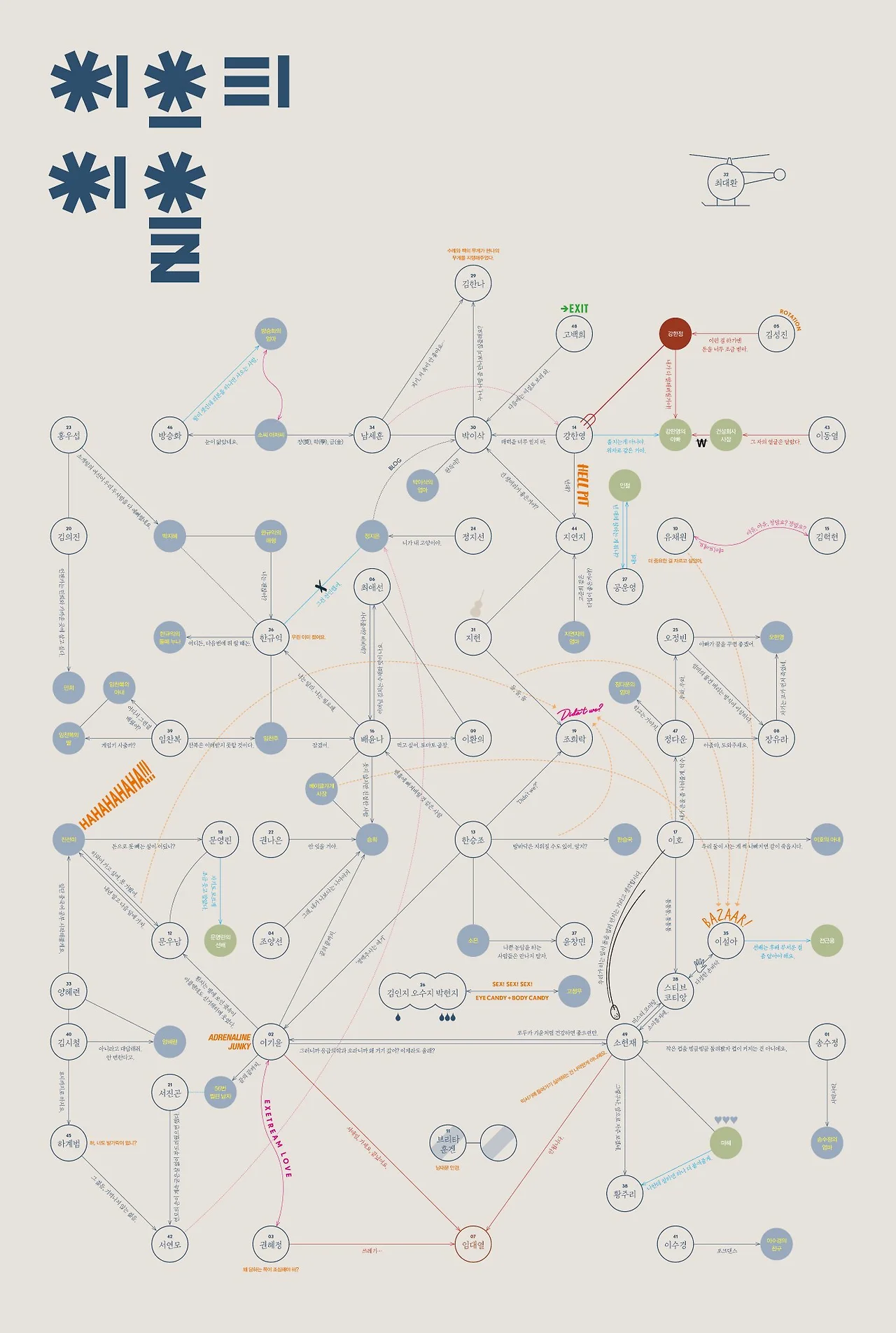 그러나 거리를 지나는 행인들 사이에서도 우연히 지인을 발견하는 순간들이 가끔씩 있곤 한다. 좁디좁은 세상이라며 서로가 얽혀 있는 관계들에 대하여 앞사람과 넋두리를 늘어놓기도 한다. 의외로 인간들 사이에는 겹겹의 조각들이 각각의 갈래에서 공유되고 연결되는 일이 무수한 편이다. 마치 퍼즐 같이 보기에는 오묘하게 비슷하면서 제각각의 자리를 굳건히 차지한다. 그러한 각자의 공통점들은 특정한 사건이나 상황이 될 수도, 어떤 공간이나 집단이 될 수도 있다. 세상은 사람들이 뭉치고 더해지는 공동체로 이뤄졌으므로 어쩔수 없이 위같은 설정값이 주어지게 되는 것이다.