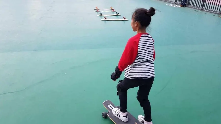 양다리를 구부린 다음 미는 발을 펴면서 앞으로 천천히 이동해요. 무릎을 살짝 굽히고 무게 중심은 조금 앞으로 위치시켜야 뒤로 쏠리거나 넘어지는 것을 막을 수 있어요. 그래서 앞발에 약간 힘을 줘요. 힘을 주지 않으면 휘청거리고 넘어지는 사고가 있어요. 시선은 앞을 똑바로 보면서 부드럽게 움직여요. 셋이서 배우는데 아이들이 훨씬 잘 배우네요. 무엇이든 어릴적 배우는게 좋아요.
