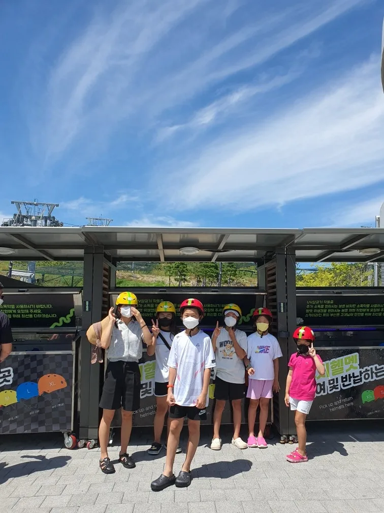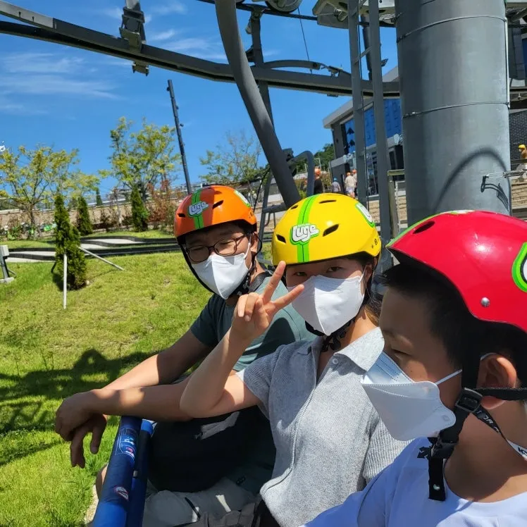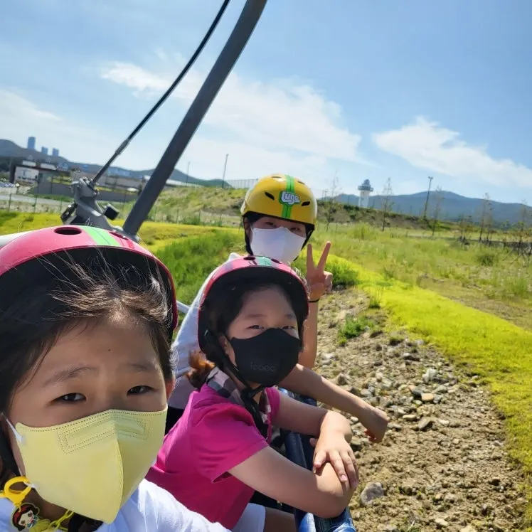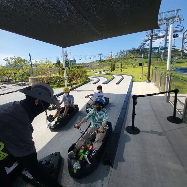 네이버에 들어가 티켓 사면 당일 바로 사용 가능해요. 현장구매보다 조금 더 저렴하니 참고하세요. 그러면 루지 타러 가 보아요. 가기 전에 안전을 위해 헬멧을 써야 해요. 사이즈별로 색깔이 다르니 하나씩 골라잡아요. 모자 색깔로 아이들의 나이 구분이 가능하니 신기해요. 나이 구분이 아니라 머리 사이즈인지 저만 알고 있어요. 나이가 어리다고 머리가 작지 않네요. 저희 딸이 딱 그러네요. 그러면 알록달록 안전 모자 하나씩 잡아들고 리프트를 타러 가요. 4명씩 탈 수 있어요. 보호자는 타기 싫은데 어쩐데요. 하지만 85~110cm 라면 보호자랑 꼭 같이 타야 해요. 만약 110cm 이상이면 혼자 루지를 타고 룰루랄라 내려올 수 있어요. 리프트 탈 때도 규칙이 있어요. 리프트 탈 때 110cm 미만 이면 보호자가 졸졸졸 따라다녀야 해요. 이런 조심스러운 규칙만 잘 지킨다면 안전하고 신나게 탈 수 있어요. 날이 쨍하고 좋으니 바람 따라 구름 따라 시원하게 올라가면 기분이 좋아요. 리프트 뒤쪽에 카트가 대롱대롱 매달려 있는데 신기하고 재미있어요. 누가 만들었는지 아이디어 굿이네요. 진짜 대단해요. 리프트 내리기 직전에 사진 찍는 곳이 있으니 타고 싶은 사람과 손잡고 올라가요. 리프트를 타고 꼭대기에 올라가면 입장하는 문이 달라요. 처음 탑승하는 사람은 루지 교육을 해야 하니 바닥의 방향을 잘 보고 가는 게 중요해요. 브레이크 사용법은 손잡이를 내 몸 쪽으로 당기면 돼요. 별도의 동력이 없으니 브레이크 조절 방법을 잘 익혀서 안전사고 없이 내 몸을 잘 보호해야 해요. 안전 수칙을 들으면 손등에 루지 스탬프를 찍어 주세요. 루지 코스는 총 4개가 있어요. 다른 이들과 내려가기 전에 서로 약속을 하고 출발해도 괜찮아요. 시합하는데 중간 갈림길에서 혼자서 다른 곳으로 빠지면 상당히 곤란해요. 빨리 간다고 좋은 게 아니니 서로 조심하며 내려가요. 너무 빨리 내려가면 5번의 기회가 휘리릭 날아가니 구름도 바라보고 멀리 바다도 보면서 천천히 내려가는 것도 재미있어요. 내려와서 PC 화면 옆에 헬멧을 스캔해요. 저의 사진이 곱게 찍혀 있어요. 1장당 만 원이니 참고하세요. 저는 핸드폰으로 찍은 사진으로 만족하려고요. 좋은 에너지 얻고 내려오니 활력이 넘치네요. 저만 뿜뿜하는 기분인지 모르겠어요. 아이들에게 좋은 추억을 안겨주었으니 대만족이요.