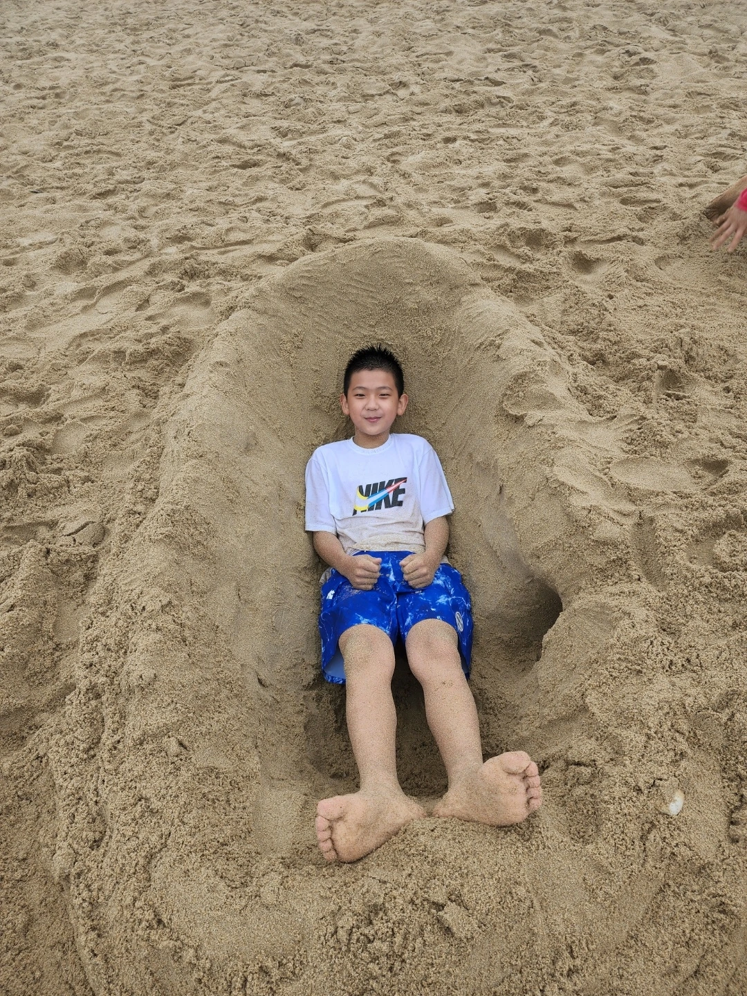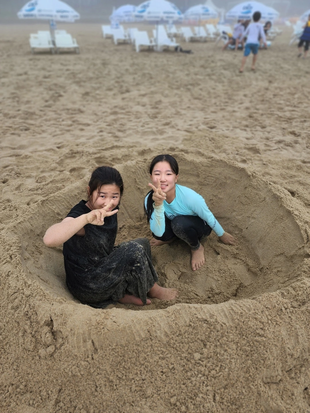 돈 터치 아시지요? 이럴 때는 아무 말 하지 않고 내버려두어요. 혼자 있을 때와 여럿이서 함께할 때는 느낌이 달라요. 그 힘은 정말 대단해요. 옹기종기 모인 아이들이 땅을 파고 있어요. 무슨 일을 꾸미는지 가만두고 저는 발가락 사이로 들어오는 모래를 조물조물 움직이며 저의 흔적을 남겨보아요. 그 속을 끝까지 팔 수 없고 무엇이 가득한지 알 수 없지만 이제는 철퍼덕 주저 않아 멀리 바다를 보며 휴식을 취해요. 옆에서 흘끔 보니 아이들이 모여서 손으로 땅을 파고 있어요. 누구 하나 망설임 없이 서로 의싸의싸 힘을 합쳐 열심히 커다란 구멍을 만들어요. 그 속에 폭 들어가 앉아있네요. 얼굴만 대굴대굴 있는데 너무 귀여워요. 땅속에 갇혀 있는데 왜 행복해 보이는지 모르겠어요. 사진 속에 그 환한 얼굴들을 곱게 담아요. 집에서 혼자 숙제하느라 끙끙대며 괴로워하는 모습은 어디에서도 찾을 수 없어요. 다른 세상에 들어와 가만히 지켜보니 아이가 무엇을 좋아하는지 단번에 알 수 있어요. 비가 조금씩 내려도 아랑곳하지 않아요. 우산을 챙겼지만 우산마저도 모래 속에 파묻혀 있네요. 아이가 원하는 것만 시켜도 아무 문제 없는데 그 결정이 쉽지 않아요. 이것저것 해야 하는 일이 많아 엄마 혼자 발을 동동 구르고 있는데 아이가 미동도 하지 않고 있을 때는 너무 답답해요. 그런데 오늘 아이의 재능을 알았어요. 바로 땅 파는 기술이에요. 기계 없이도 손으로 깊이 파는 에너지를 보니 포클레인 저리 가라 솜씨가 나오네요. 앞으로는 그 재능을 어느 곳에 쓸지 단순하게 생각하려고요. 아이가 공부를 잘하려고 노력하지 않고 자꾸 미루고 밀어내려고 해요. 공부를 잘할 수도 없으니 좋아하는 거 하며 사는 게 더 현명하다고 생각해요. 포클레인 기술을 검색하며 아이의 앞날을 생각해요. 딸이라고 못 할것이 없다고 생각해요. 미래의 아이는 포클레인에 앉아 배를 멀리 타고 두바이에서 요즘 유행하는 초콜릿 먹으며 땅을 파고 있을지 모르잖아요. 엉뚱한 상상을 하는 엄마를 만나서 아이가 고생이 많아요. 하지만 아이가 어디까지 향하는지 지켜봐 주세요. 목적지가 없어서 답답하지만 어디든 도착해서 당당하게 살아갈 거라 믿어요.