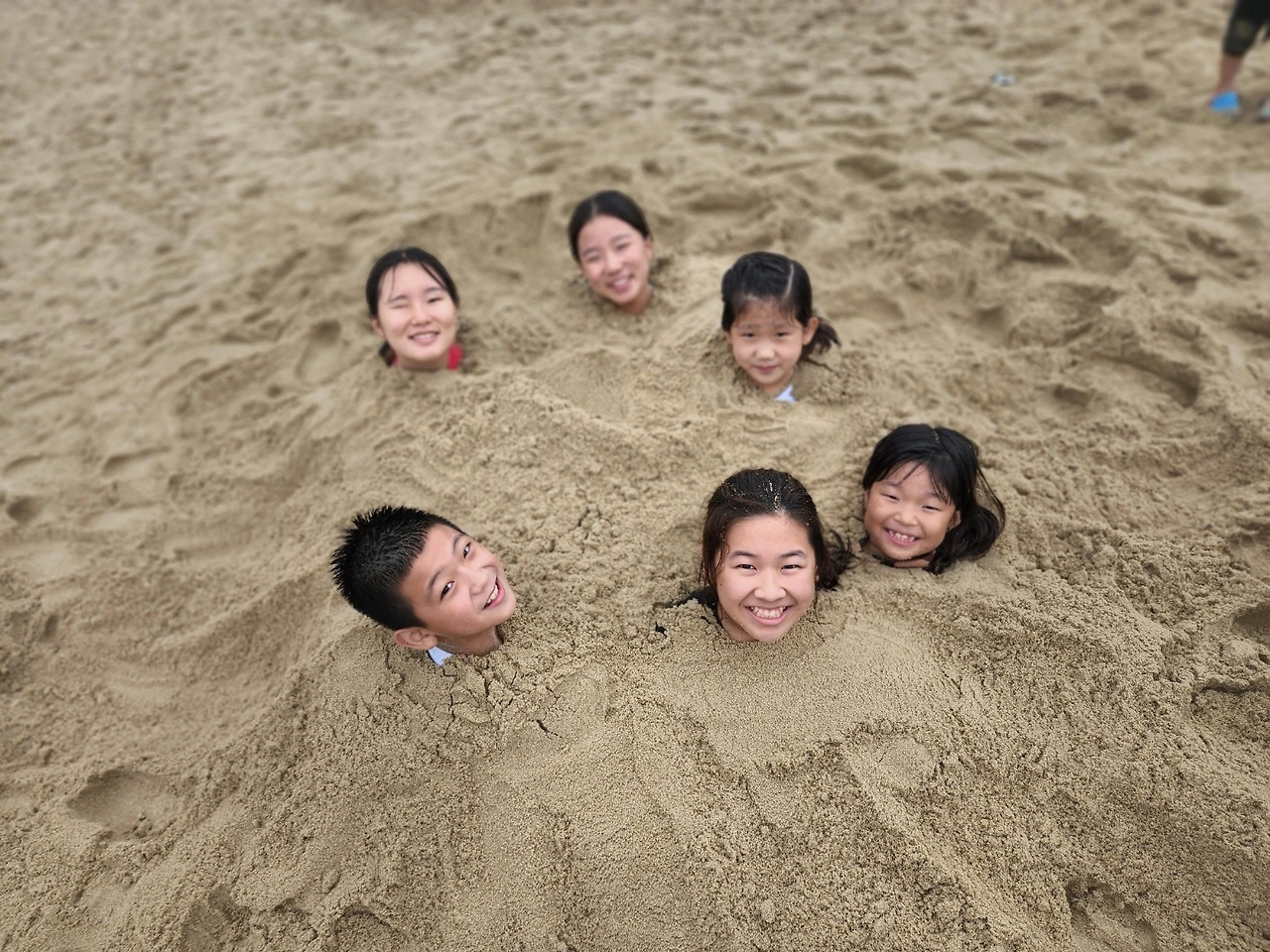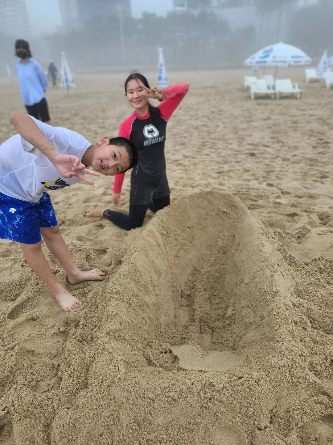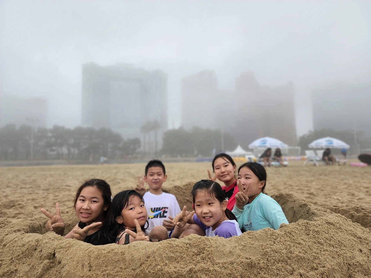 부산 바다에서 다 같이 모래 파기 아이들이 무슨 상상을 하든 가만두어요. 또한 어떤 행동을 하든지 옆에서 지켜보기만 해요.