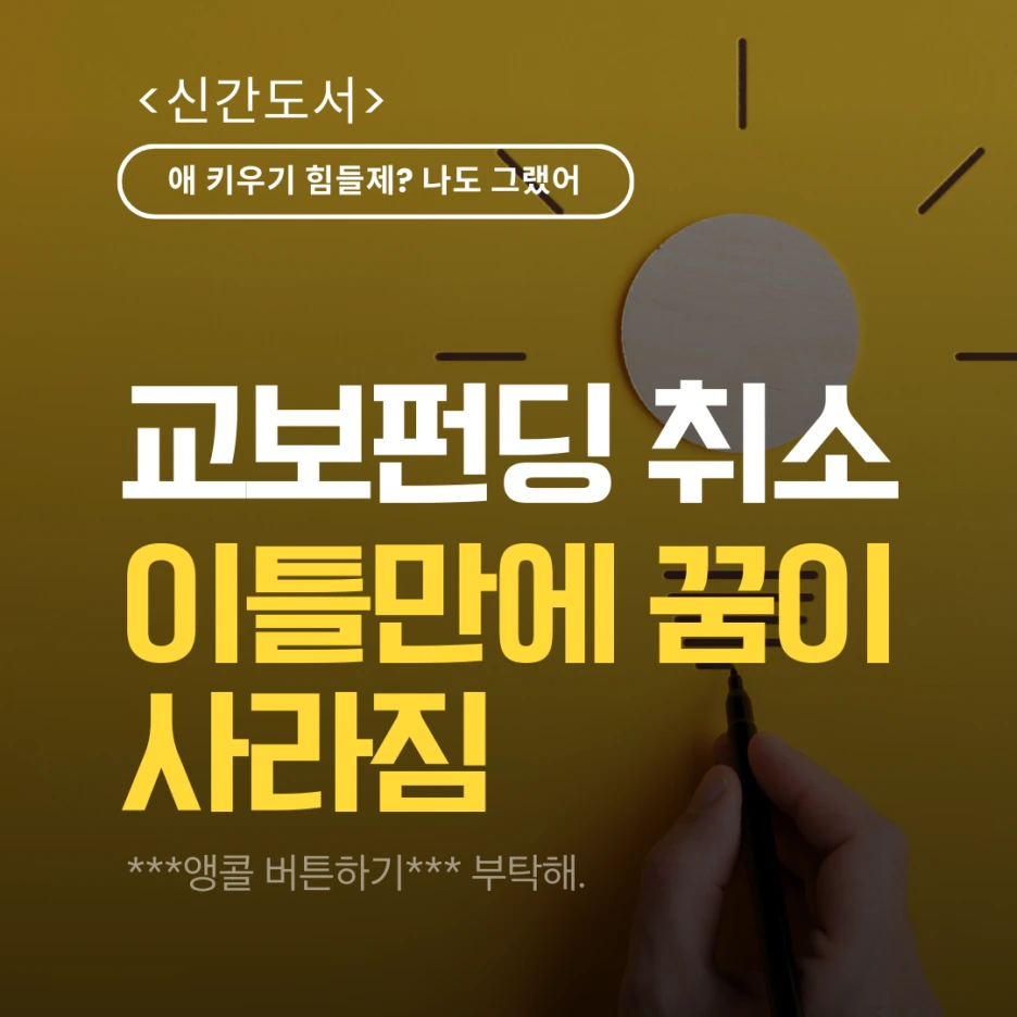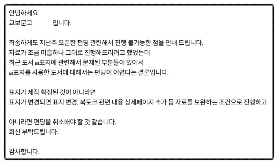 <애 키우기 힘들제? 나도 그랬어> 내 개인 저서 책일 3일차 되는 날 교보펀딩 취소되었어. 이유는 책표지가 AI라는 거야. 교보펀딩 시작 전에 사전 공지나 어떠한 요구사항도 없이 펀딩이 취소된 거야.