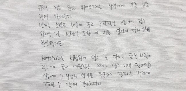 선생님 말대로 정말 언젠가 다시 마주칠 수 있으면 좋겠다. 어떤 모습이실까? 내가 아이 둘 엄마로 허둥지둥 살고 있는 걸 보시면 왠지 깜짝 놀라실 것 같다. 다시 만나게 된다면 그땐 나도 선생님께 전하고 싶은 말을, 그런 내용이 담긴 책에 적어서 선물하고싶다.