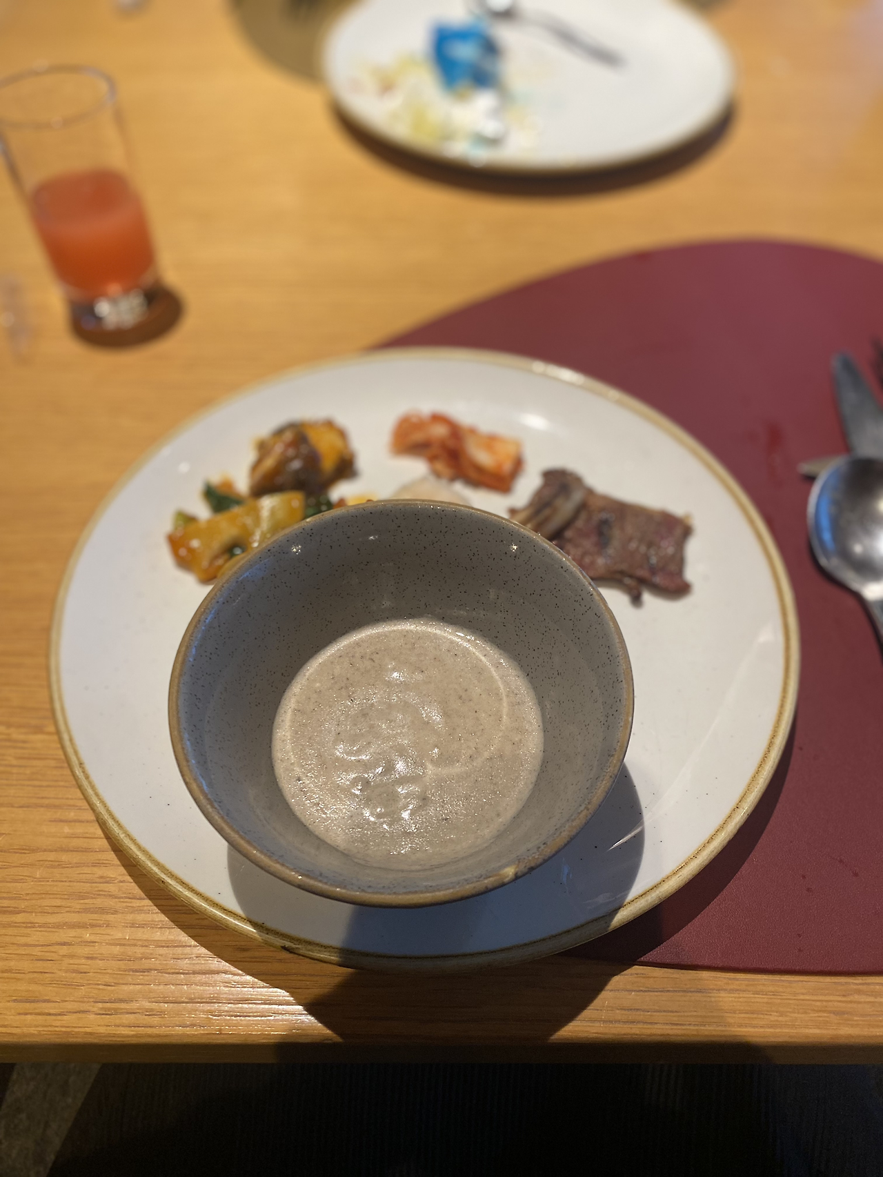 그런데 정작 내가 매너가 없었다. 보기만 해도 다 먹고 싶었다. 침착해. 침착해. 차가운 음식부터 먹고 따뜻한 음식 넘어가고. 는 개뿔. 막 그냥 양갈비 먹고 스테이크 먹고 메밀마끼 먹고. 랍스터랑 새우랑 막 다 갖다 먹고. 남편은 말을 안 한다. 그저 먹는다. 누가 쫓아오니? ㅋㅋㅋㅋ 그렇게 전투적으로 먹는데 계속 외면했던 양송이스프가 눈에 아른거린다. 나는 원래 뷔페에 오면 무조건 양송이스프가 첫 그릇이다. 위를 연다. 그런데 여기는 다른걸 한 조각씩만 먹어도 16만 원 뽕을 뽑을까 말까인데 양송이스프에까지 줄 여유가 없다. 그렇다. 뽕을 뽑겠다는 의지가 양송이스프를 외면케 만들었다.