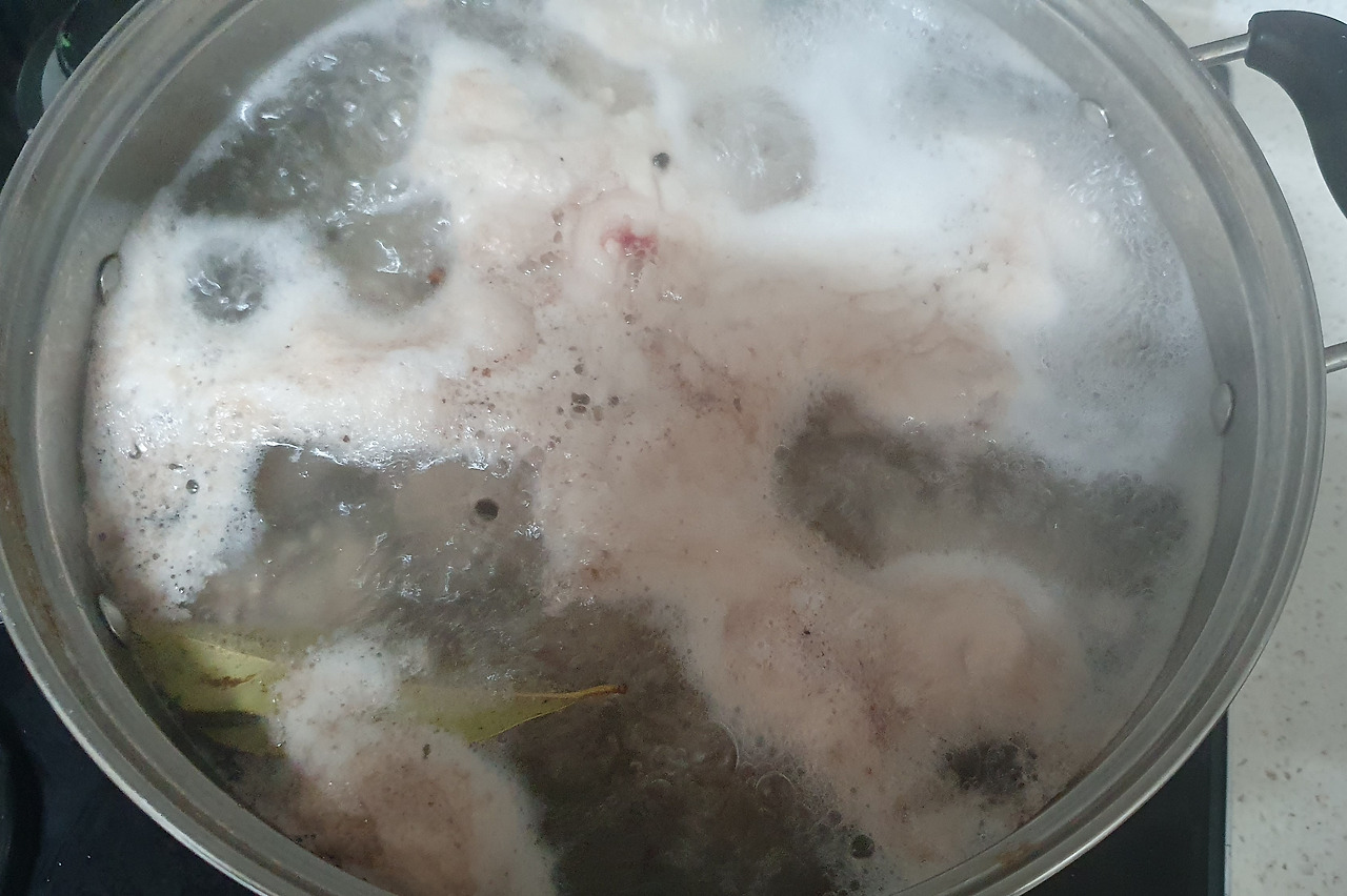 먼저 불순물 및 잡내 제거를 위해, 냄비에 닭이랑 통후추, 월계수 잎 한 장 넣어 팔팔 끓였다.