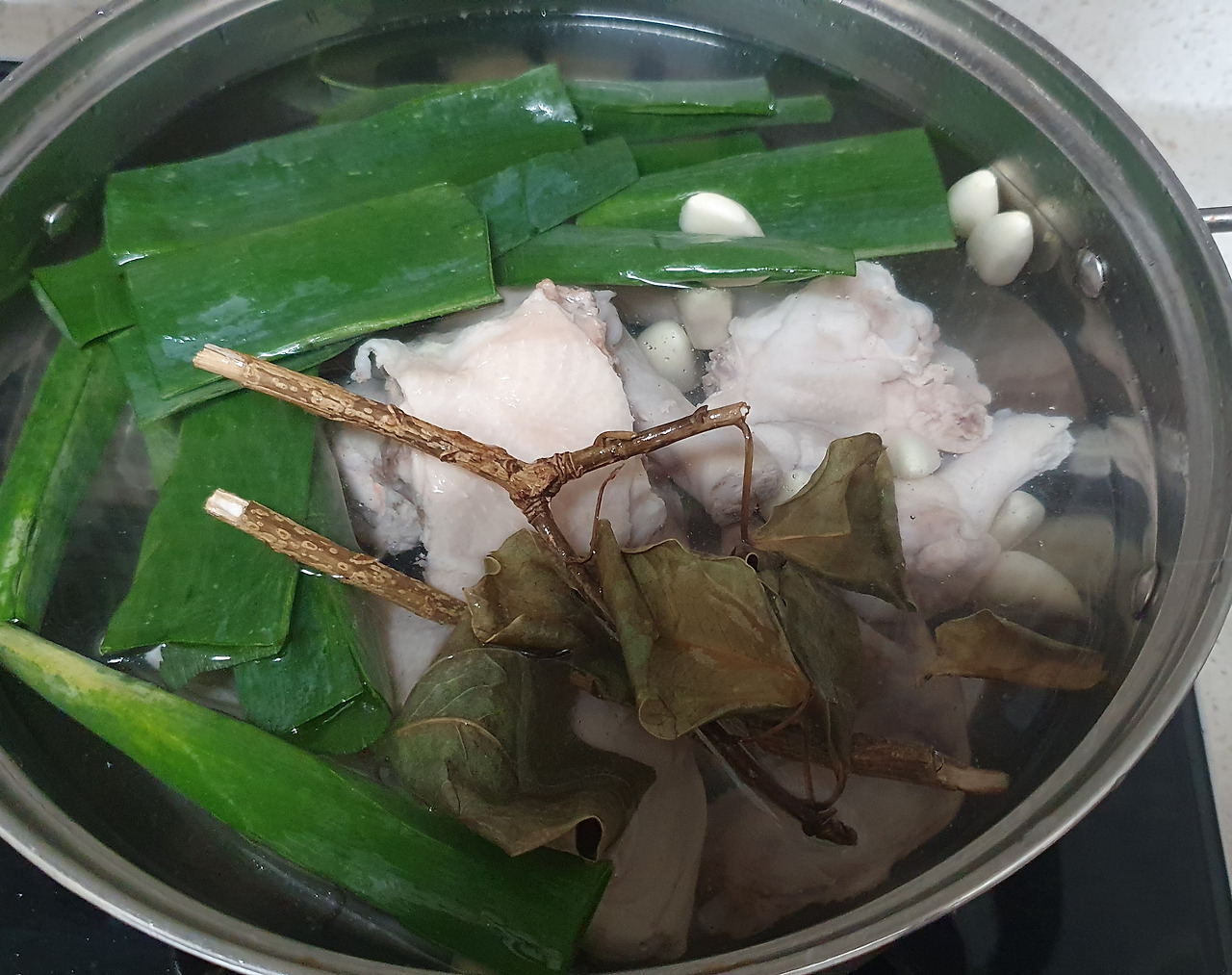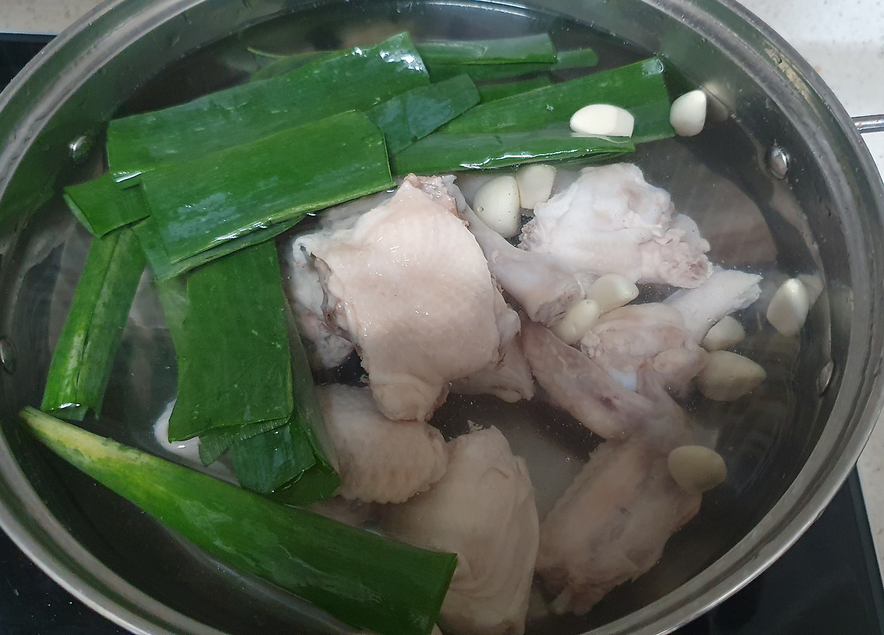 깨끗한 냄비에 손질된 닭과 대파, 마늘을 넣고 정수 물 넣어 본격적으로 끓일 준비를 한다.