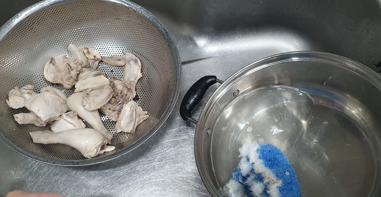 한소끔 끓어오르면 불 끄고, 채반에 닭 쏟아부어 찬물로 하나하나 씻는다. 이 과정에서 자잘한 뼈도 씻기고 자연스레 닭껍질도