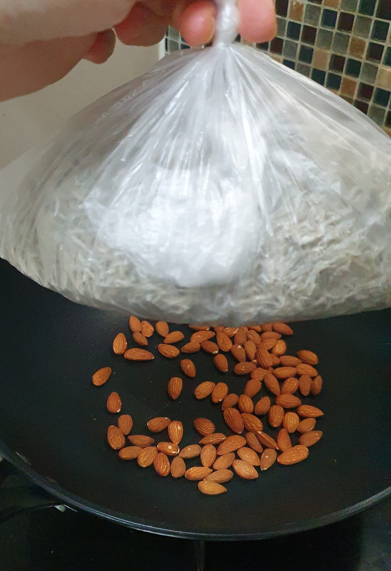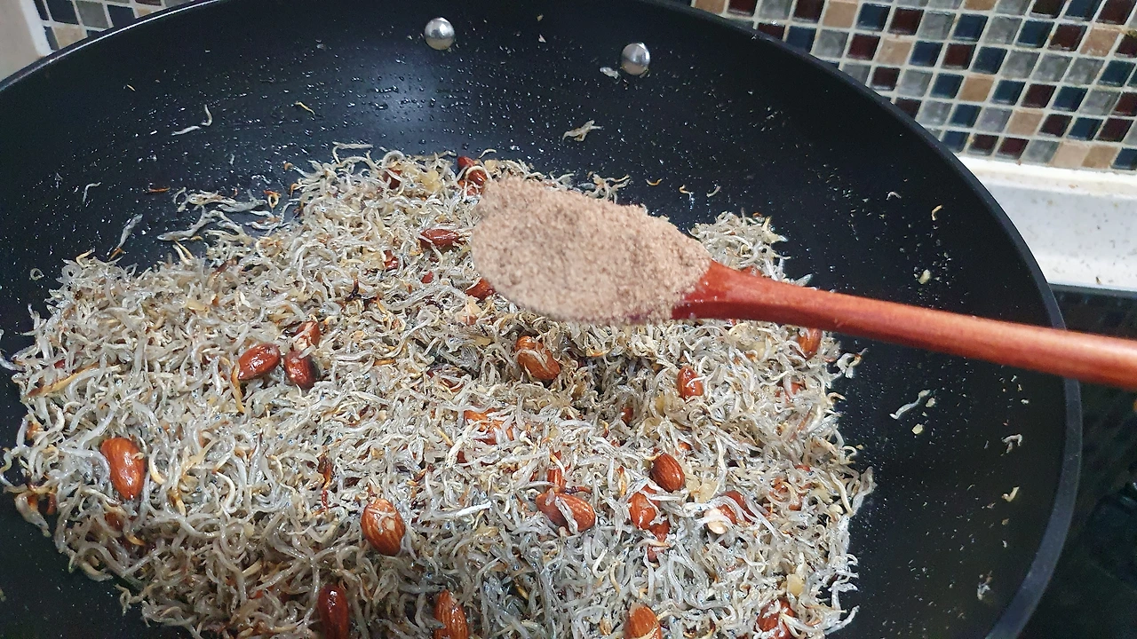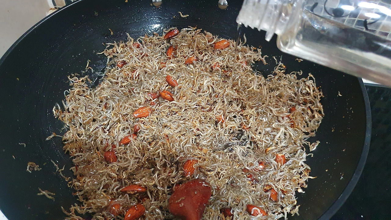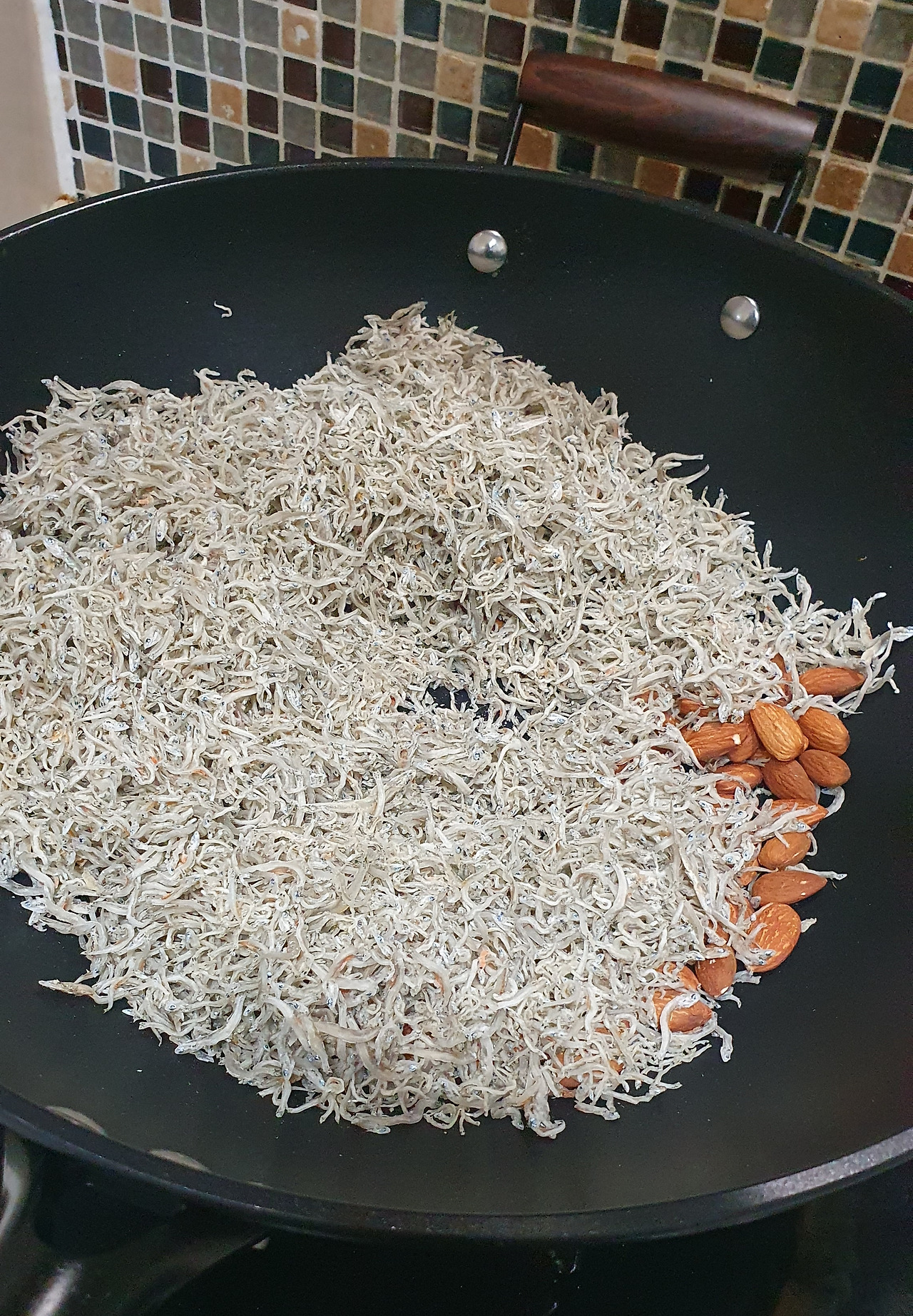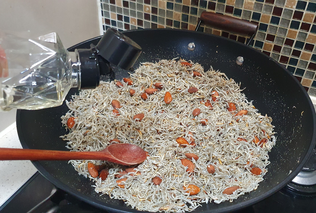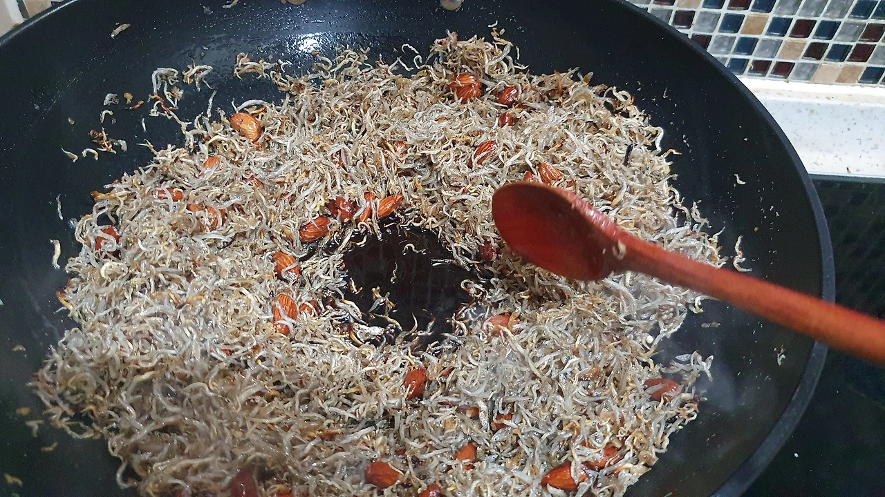 냉동실에 소분해 놨던 잔멸치 한 봉지인데, 큰 웍에 부어보니 양이 꽤 많았다. 냉동실에 같이 있던 아몬드도 같이 넣어 약불에서 아주 오래 볶아줬다. 조금의 수분도 허락하지 않기에 수분 없는 바삭바삭한 상태가 될 때까지 오래오래 볶았다. (내 생각에는 멸치볶음의 핵심이 바로 이 부분, 마른 멸치 볶아주기라고 생각한다.)
