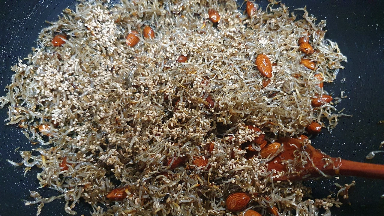 "나는 어렸을 때 엄마가 다른 반찬은 못해줘도 멸치볶음이랑 진미채무침은 꼭 해줬거든~ 멸치볶음 해주면 애들 키도 크고 뼈도 튼튼해질 것 같아서 좋을 것 같아."