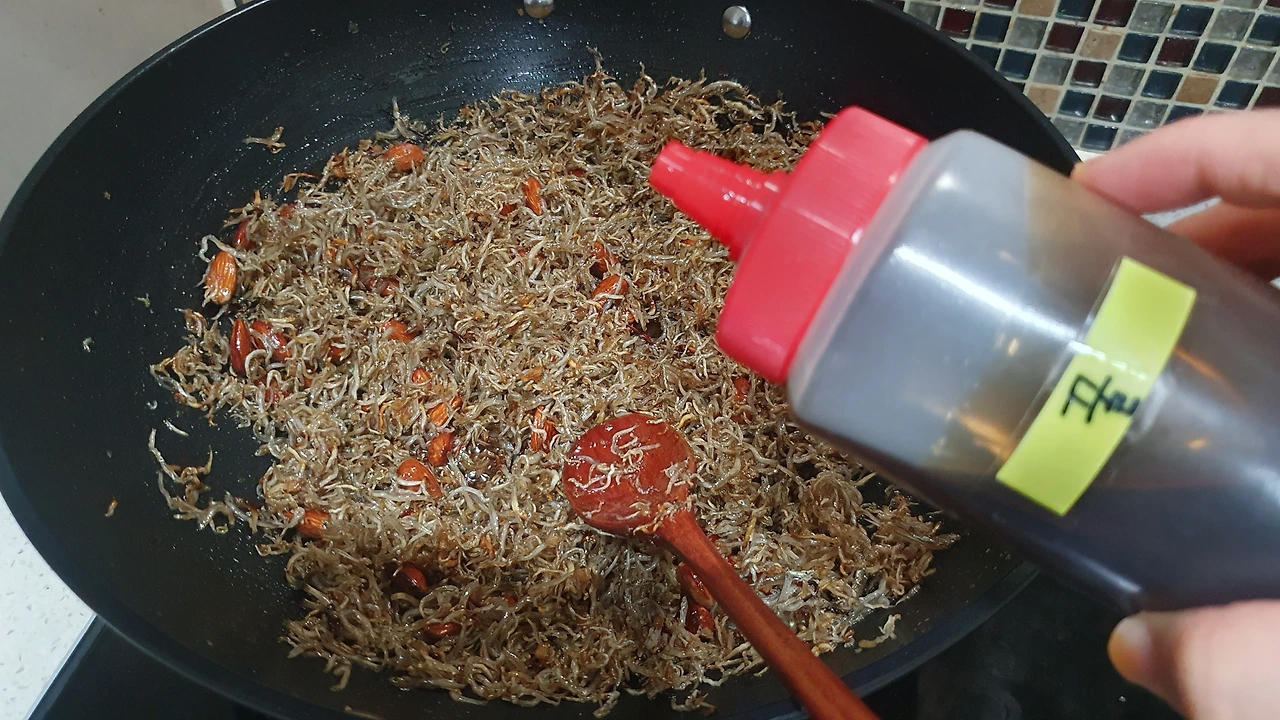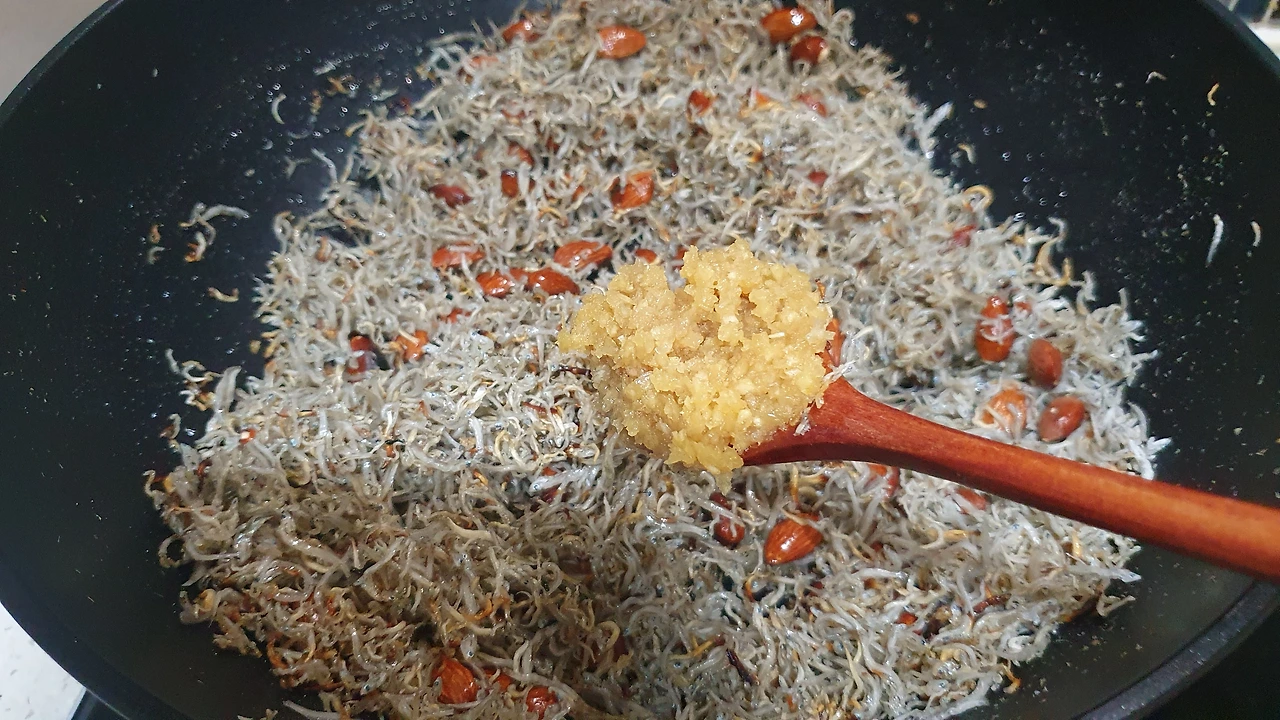 맛을 살짝 보니 멸치에 짠맛이 강한 것 같아 추가로 꿀 한 숟가락 더 넣었다.