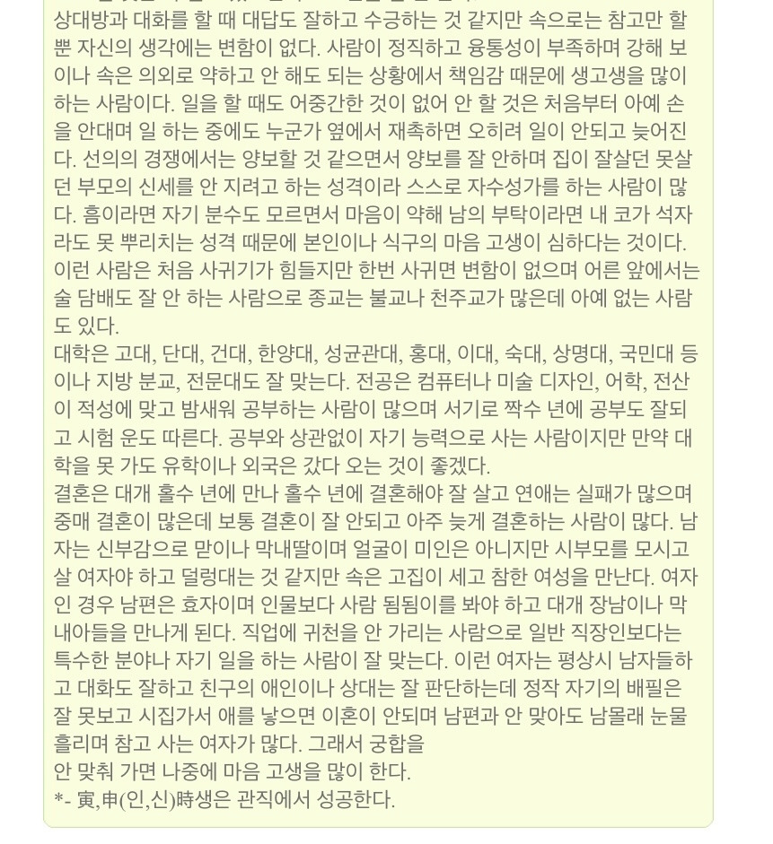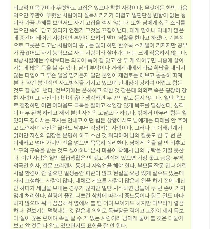 "성격이 너무 완벽하려고 해서, 본인 자신은 고달프다 하겠다.", "겉보기에는 덜렁대는 것 같은데, 의외로 독불장군 격이고 고집이 세서 득 보다 실이 많은 편이며, 속을 알 수 없는 사람이라 남에게 물어볼 것은 다 물어보고 알 것은 다 알고 있으면서도 표현을 잘 안 한다."