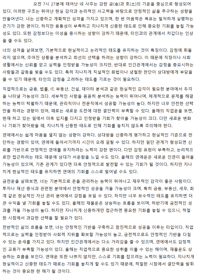 뒤이어 나는 과거에 인터넷을 통해 봤던 사주팔자를 살펴보게 되었다. 이는 다소 부족하게 다가와 챗GPT에게 내 사주팔자에 대한 질문을 던졌다.